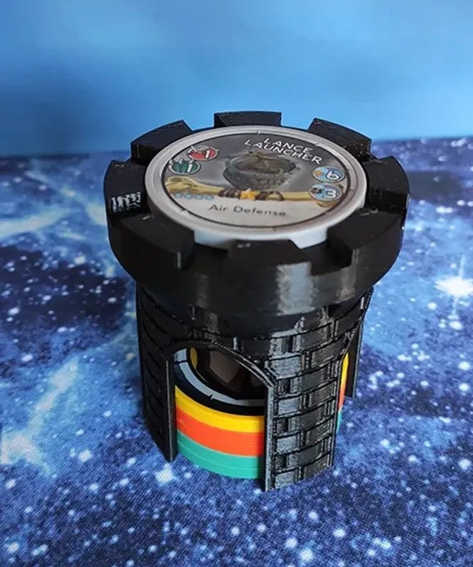 Cette mini-tour maintient fermement la pile de jetons tout en exposant clairement le jeton de spire au sommet, offrant une meilleure lisibilité pendant la partie sans gêner l’accès aux améliorations en dessous.