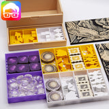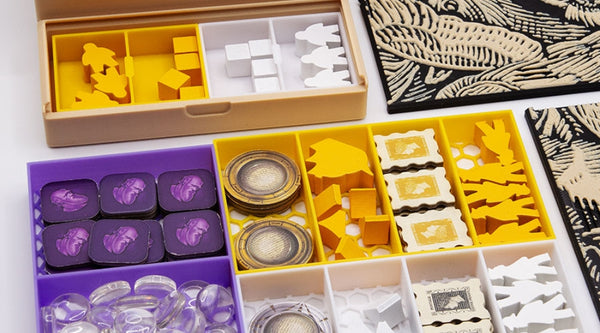 Jetons, meeples, pièces et composants spéciaux sont parfaitement séparés pour une mise en place fluide et un rangement impeccable.