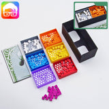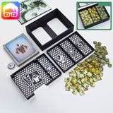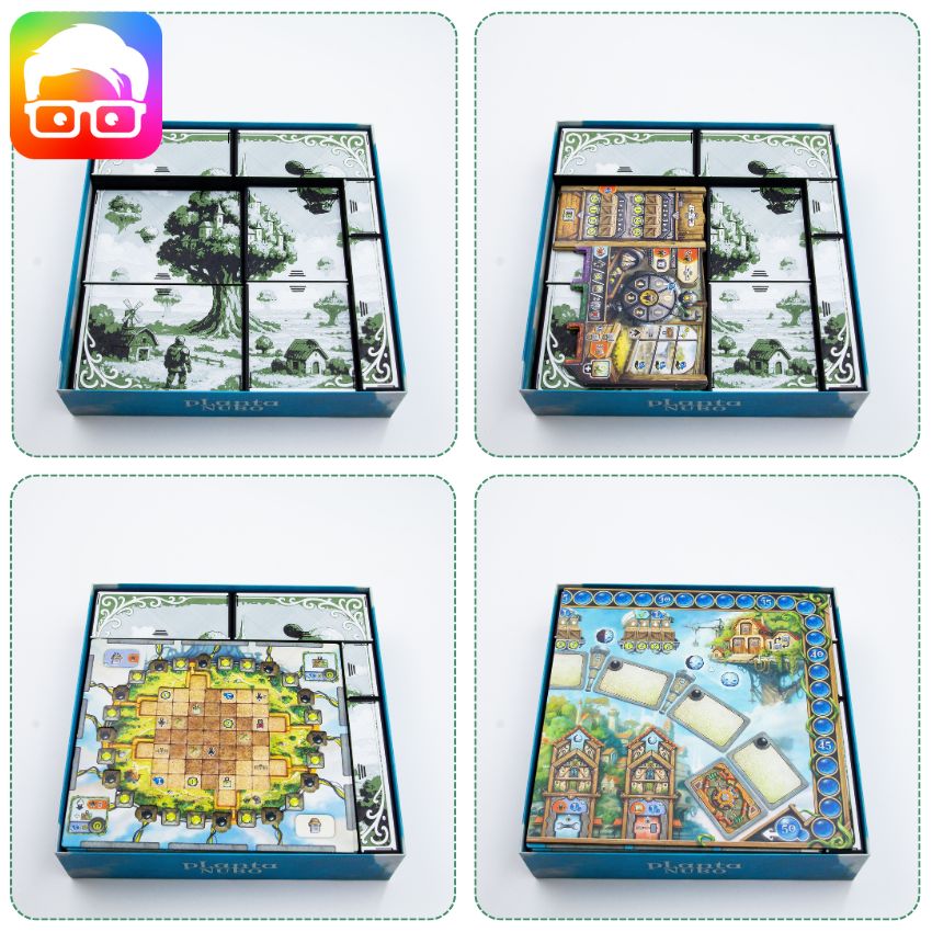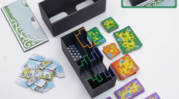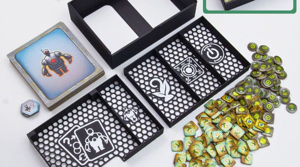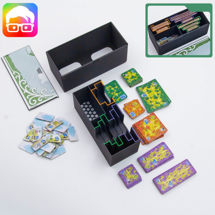 Chaque tuile trouve sa place Rangement optimisé des tuilesDes bacs compartimentés aux parois ajustées accueillent toutes les tuiles du jeu, qu’il s’agisse des plateaux individuels ou des modules colorés. Tout est organisé pour un accès rapide pendant la partie.