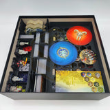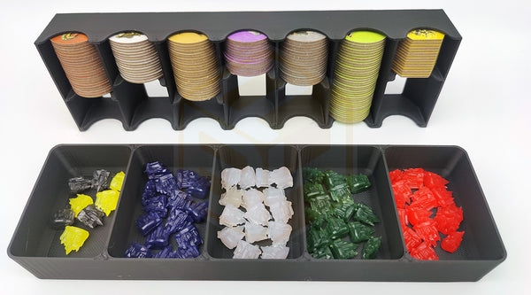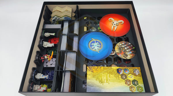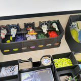 Cartes, figurines, tuiles, jetons : chaque élément est parfaitement rangé, visible et accessible. L’espace libre restant ne permet pas le rangement vertical, mais il peut accueillir des tapis de jeu ou de futures extensions – une solution pensée pour durer.