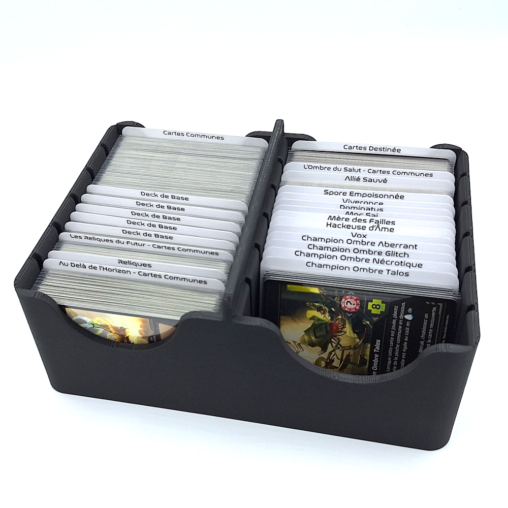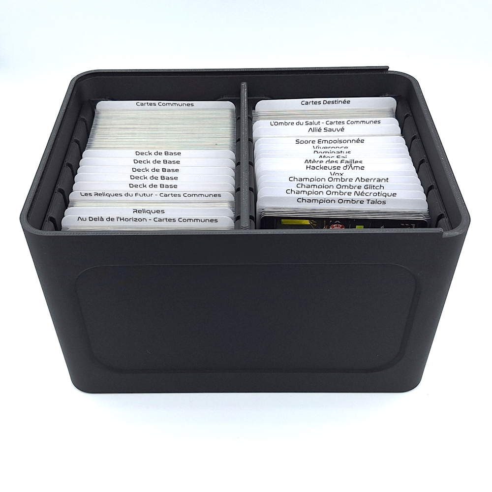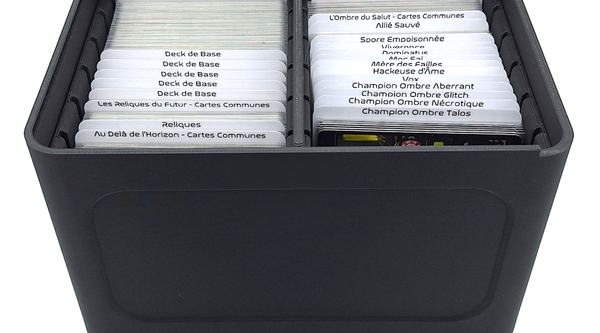 Cette boîte accueille l'intégralité du contenu publié en français pour Shards of Infinity, y compris les trois extensions. Les cartes sleevées s’insèrent parfaitement dans deux colonnes structurées, pour un rangement net, sans compromis.