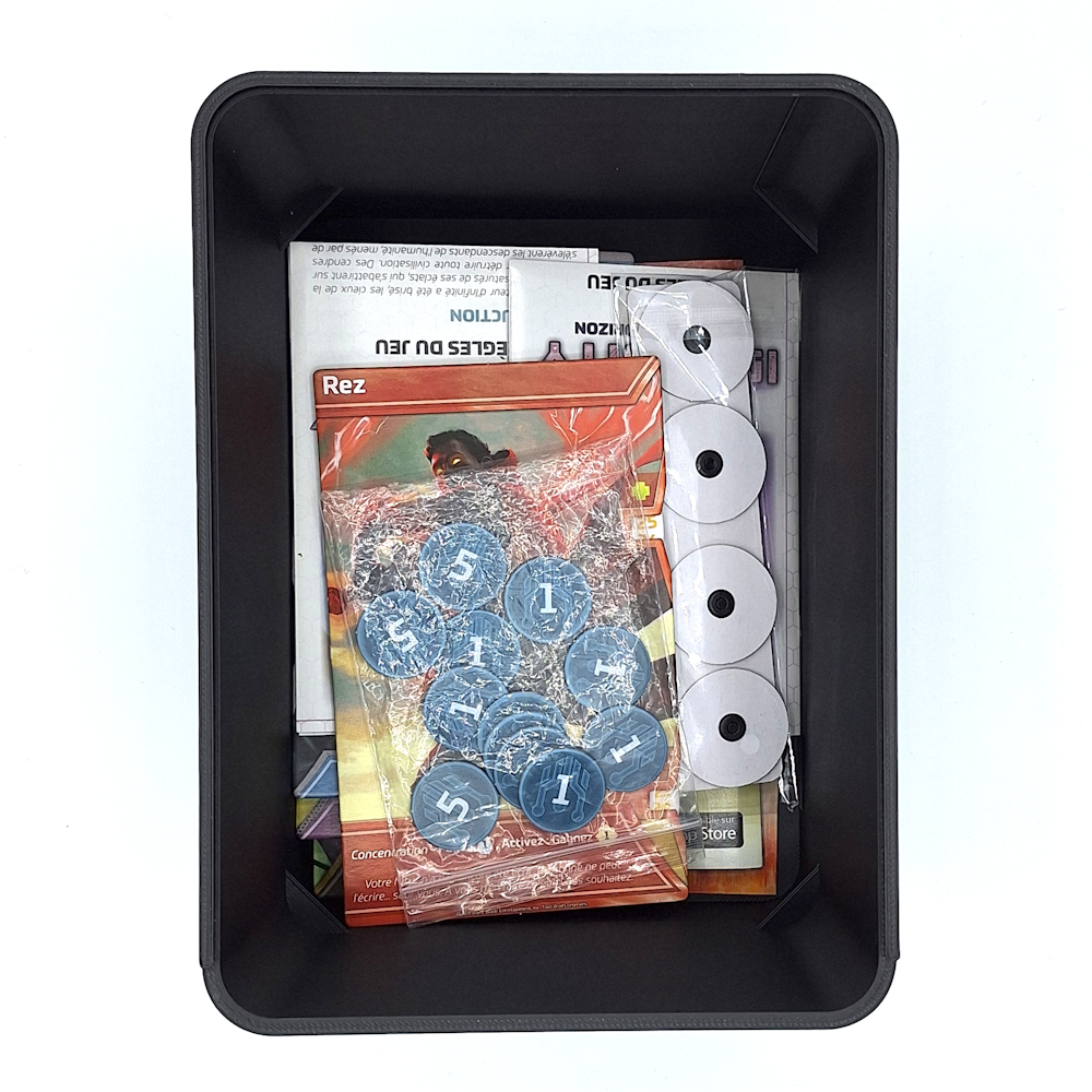 Sous le panier de cartes, un espace dédié accueille tous les éléments de jeu hors cartes. Tout reste à portée de main, sans forcer ni abîmer — une optimisation de l’espace maligne et efficace.