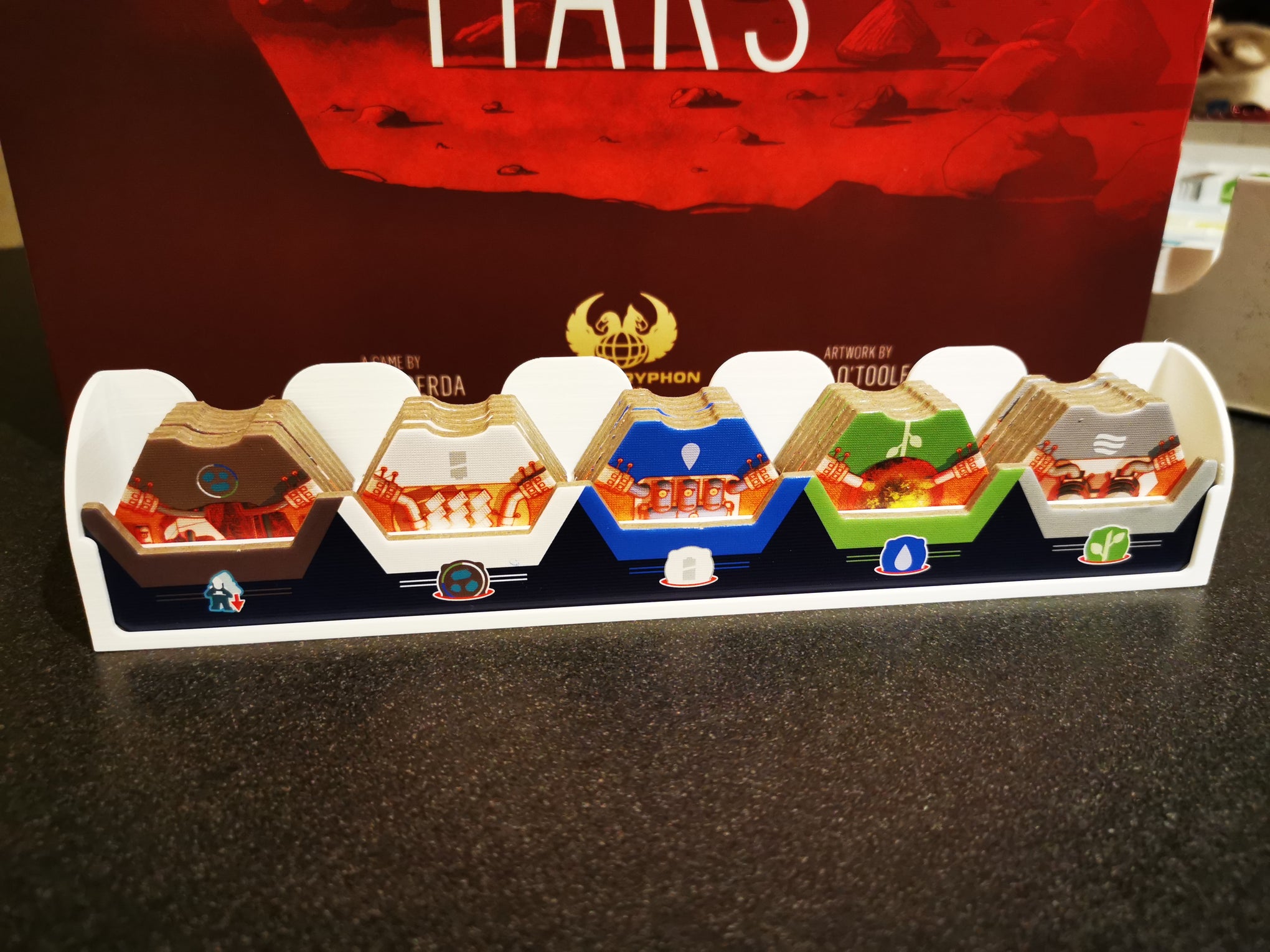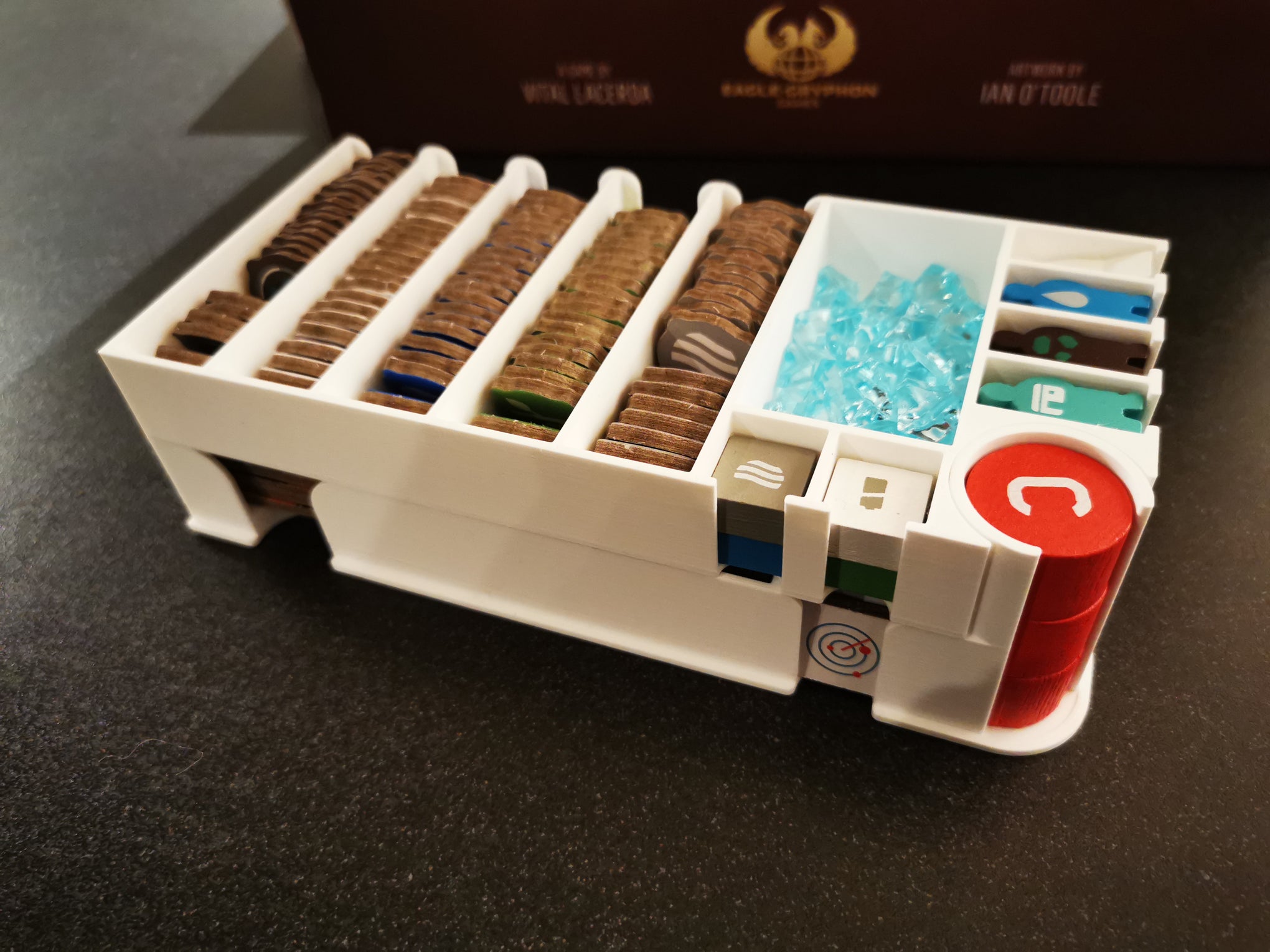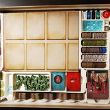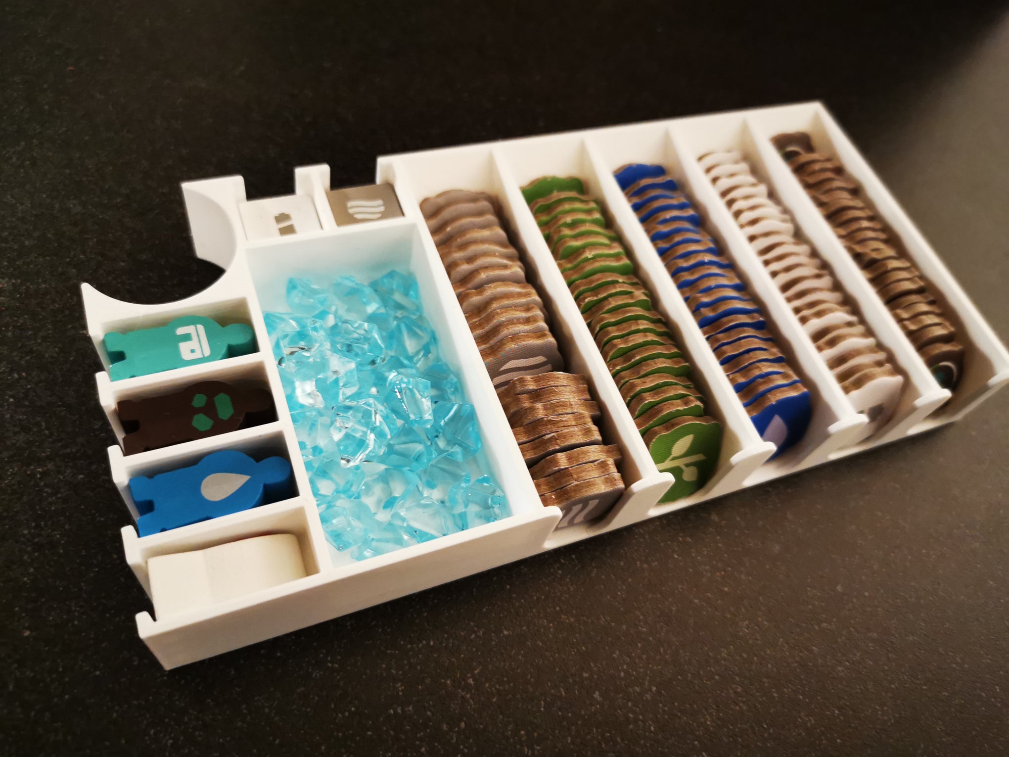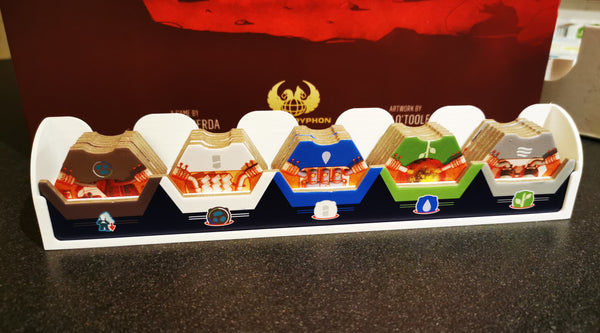 Les trays sont pensés pour être visuellement explicites : chaque emplacement est décoré d'icônes correspondant aux types de bâtiments ou ressources, facilitant le tri et la mise en place directe sur la table, sans confusion.
