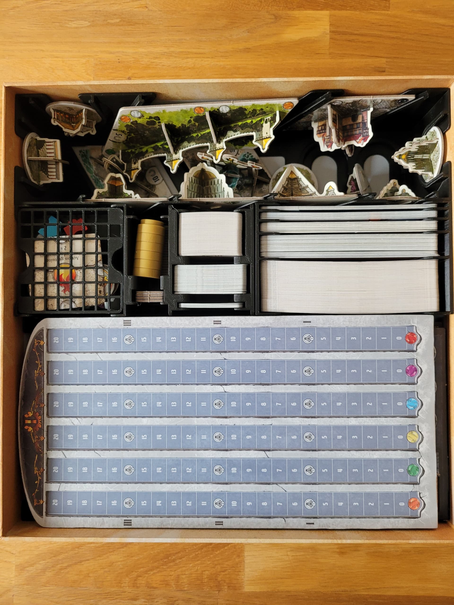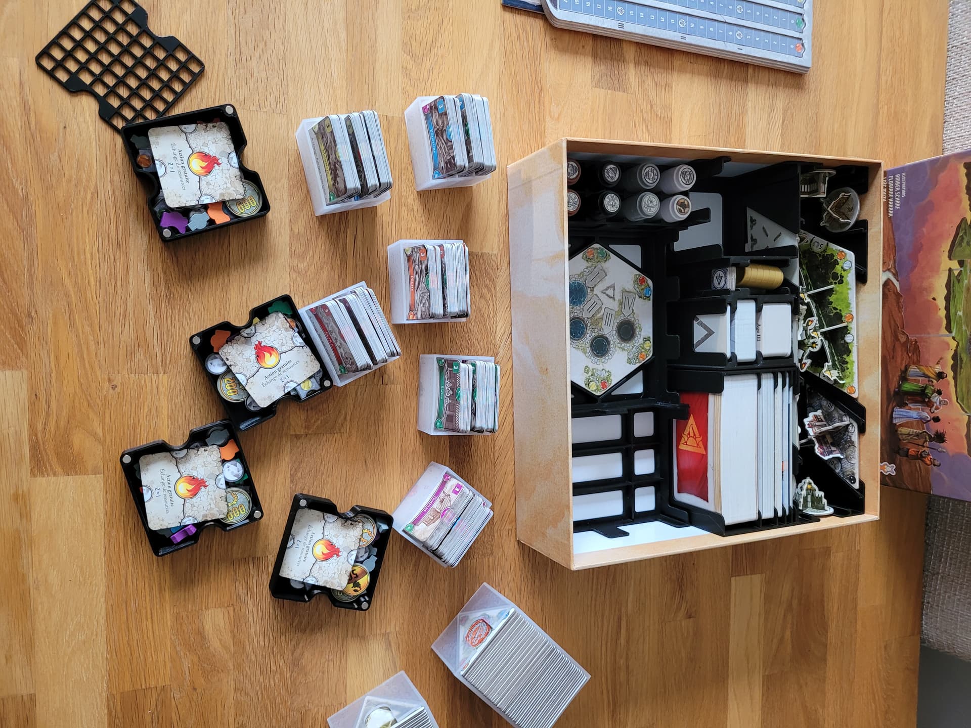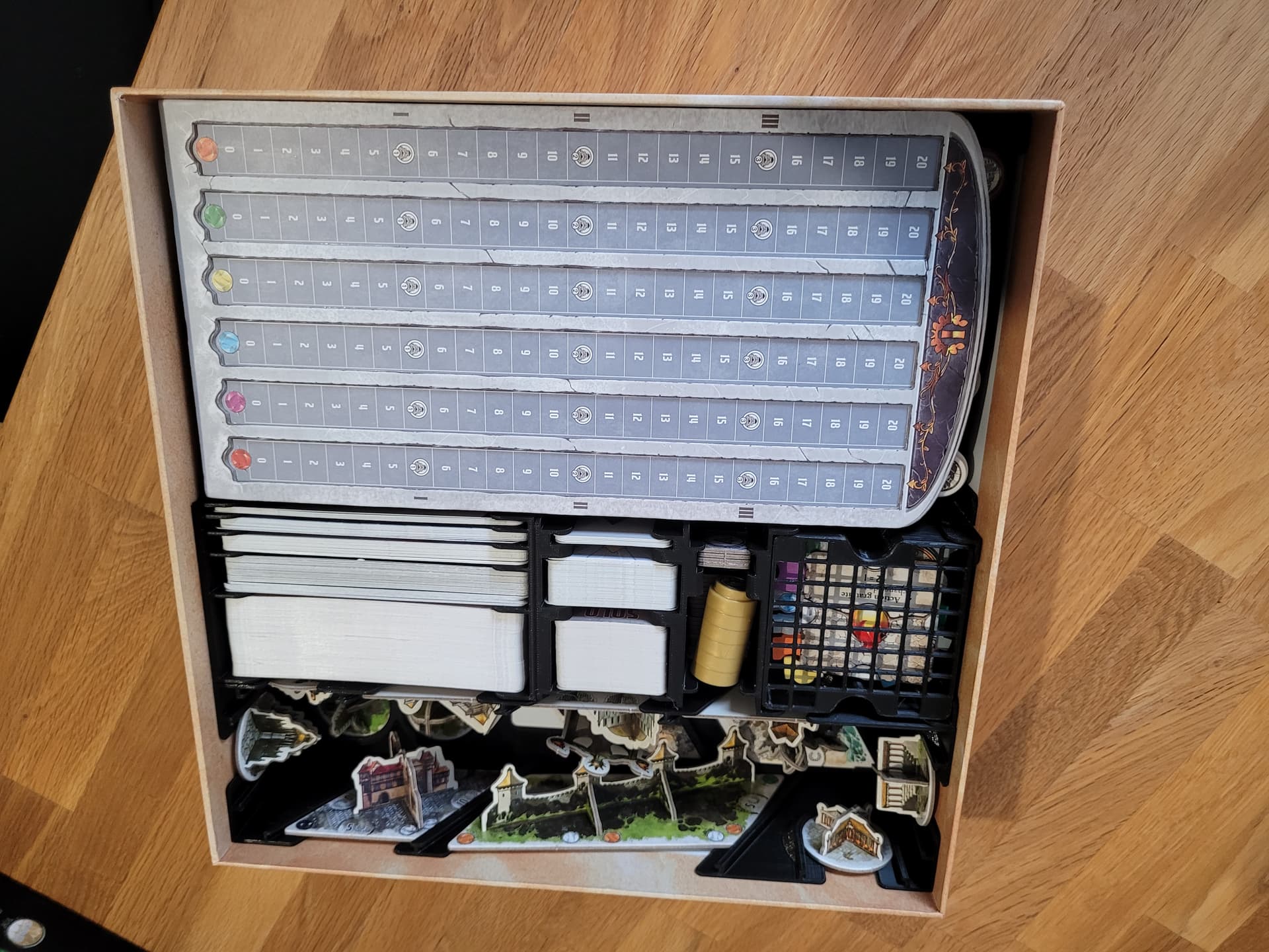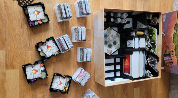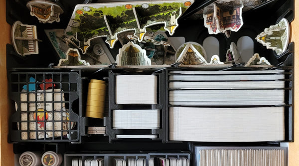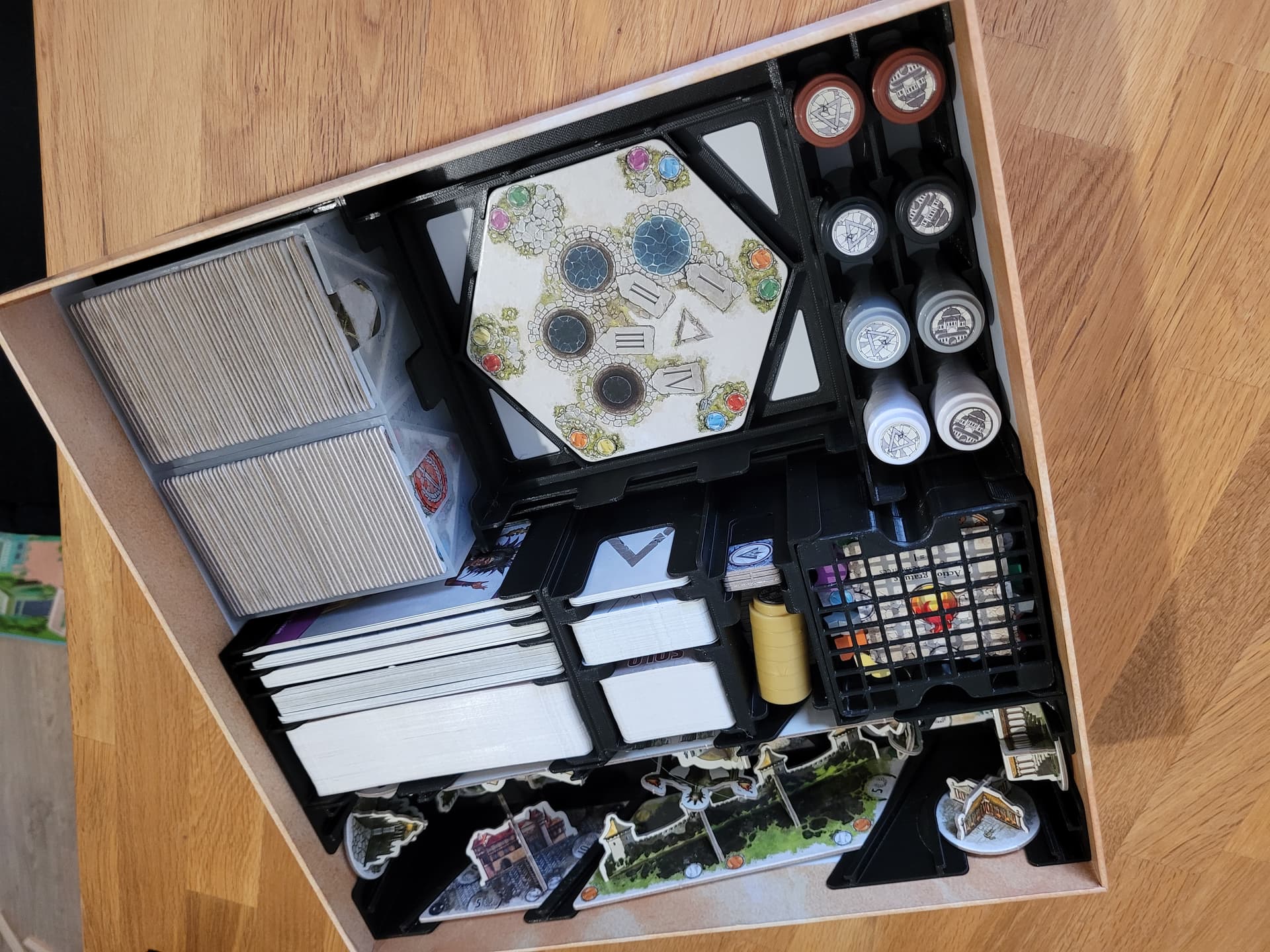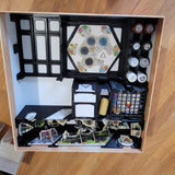 Grâce à une structure compartimentée, toutes les cartes et tuiles (jeu de base + extension Rise & Fall) tiennent dans la boîte de façon lisible et accessible, même en position verticale. Rien ne flotte, tout est calé.