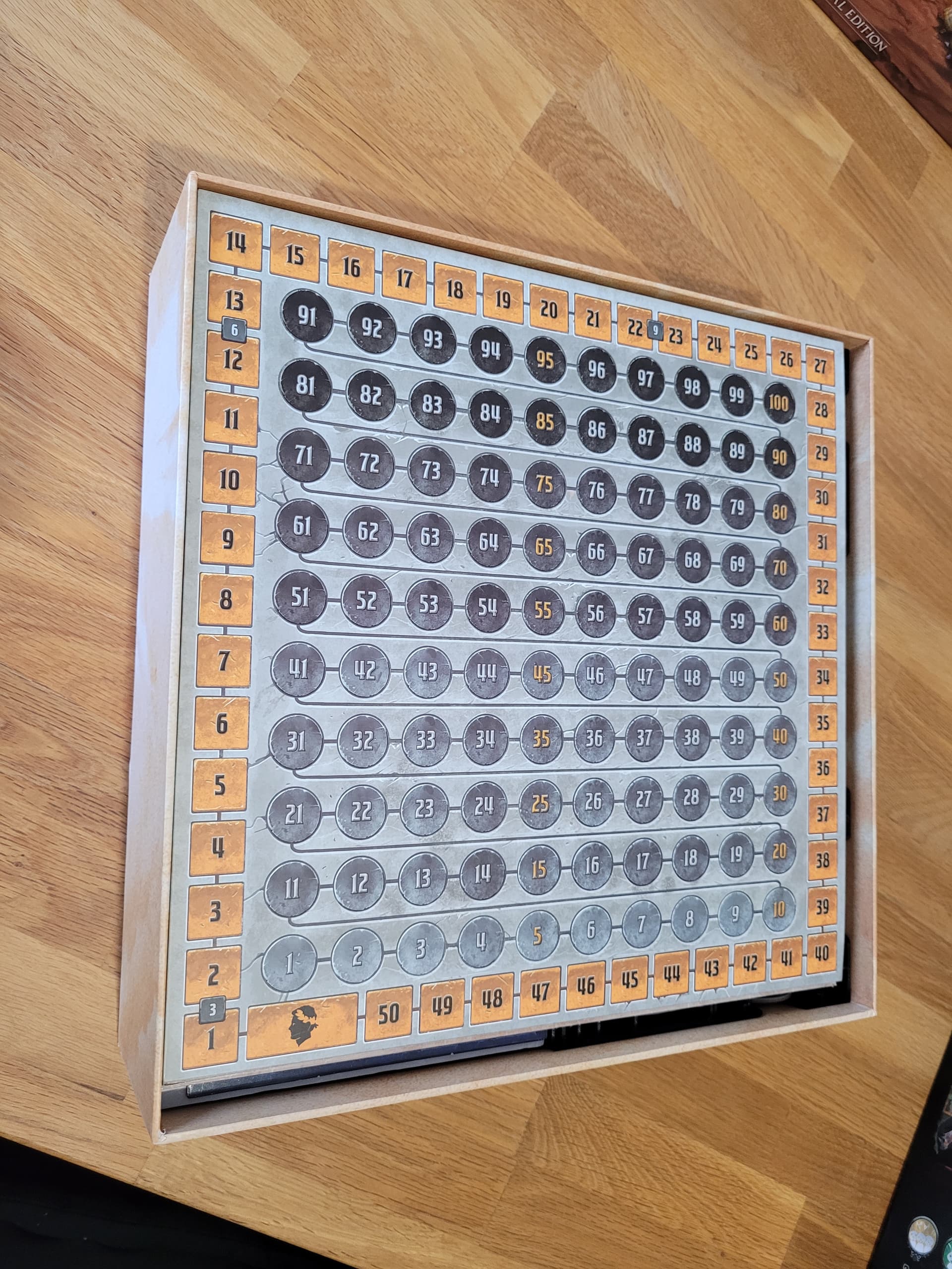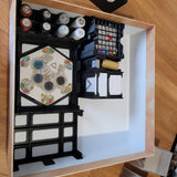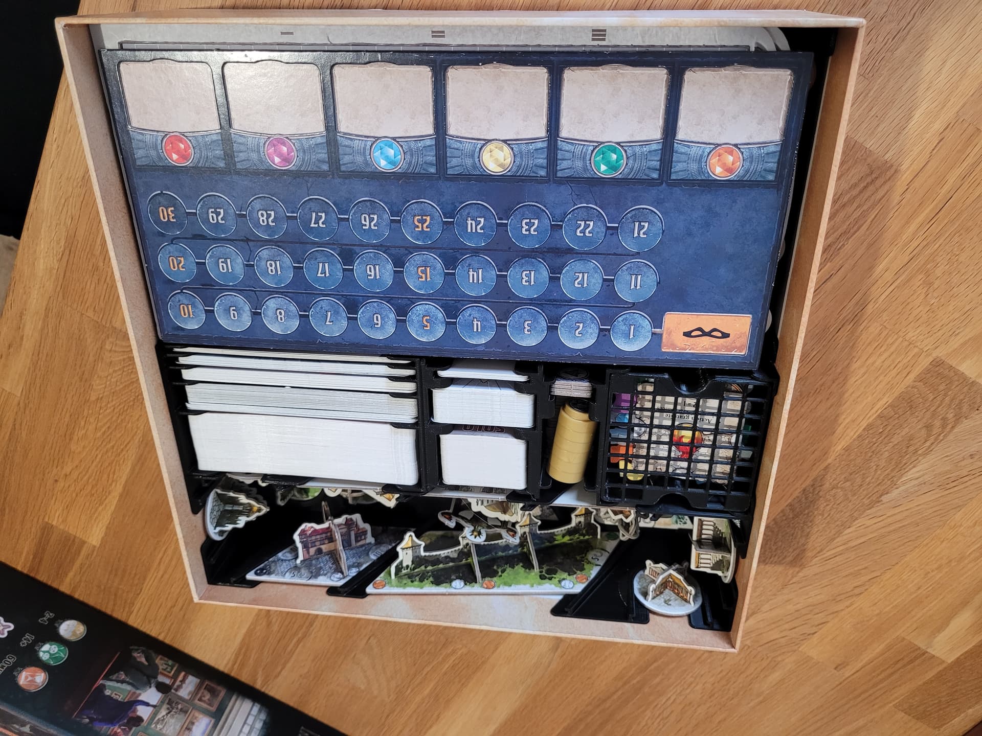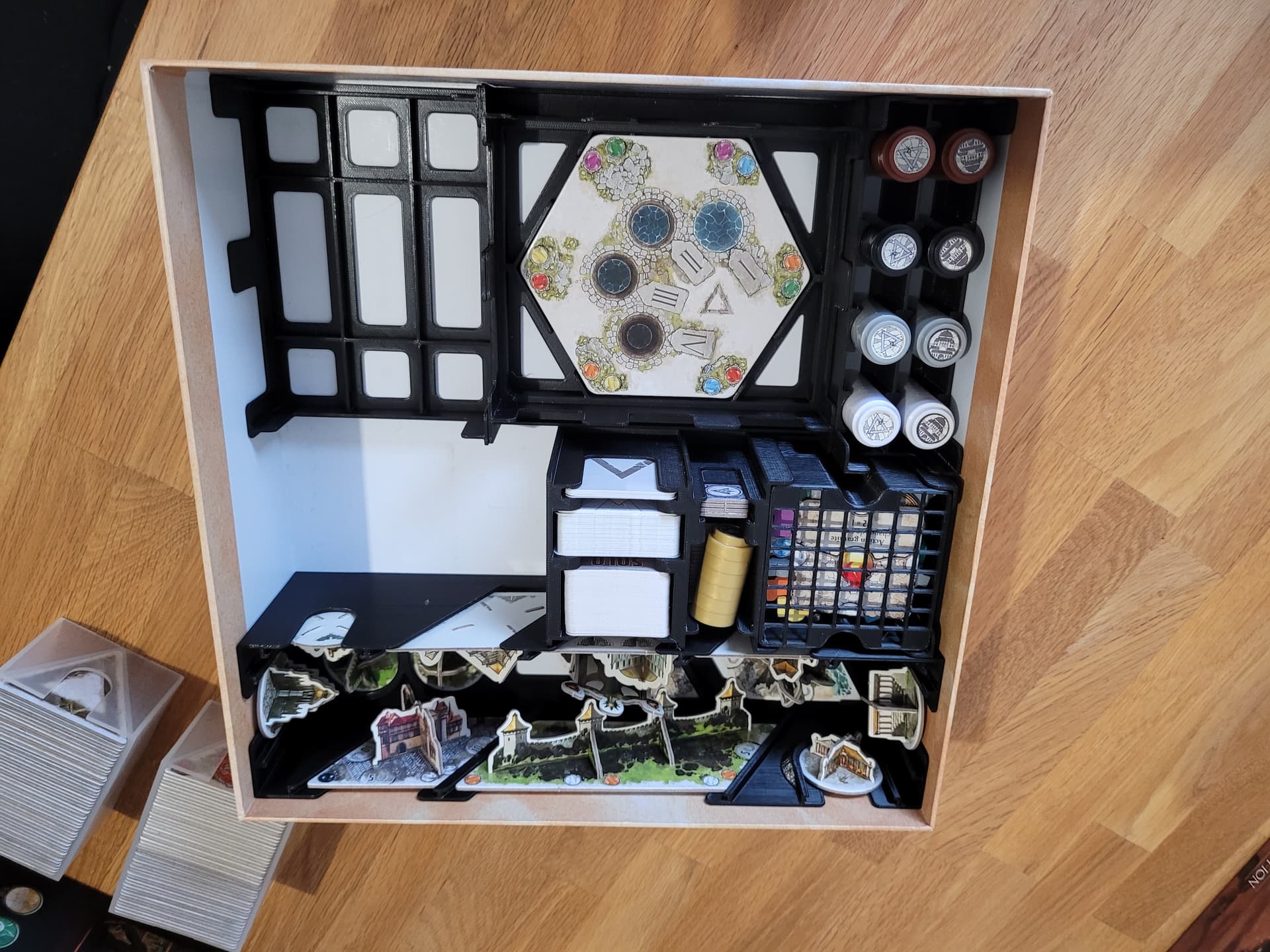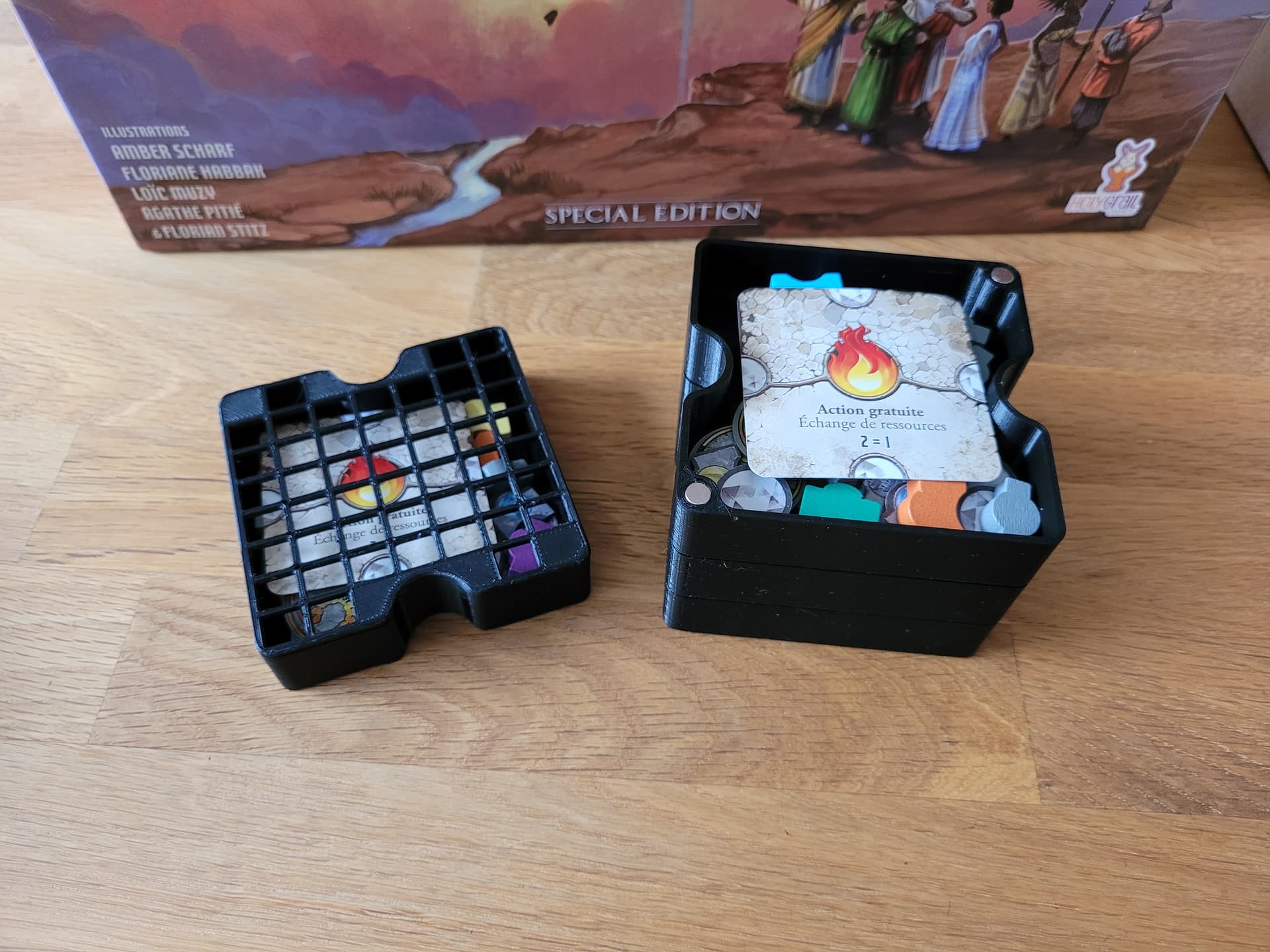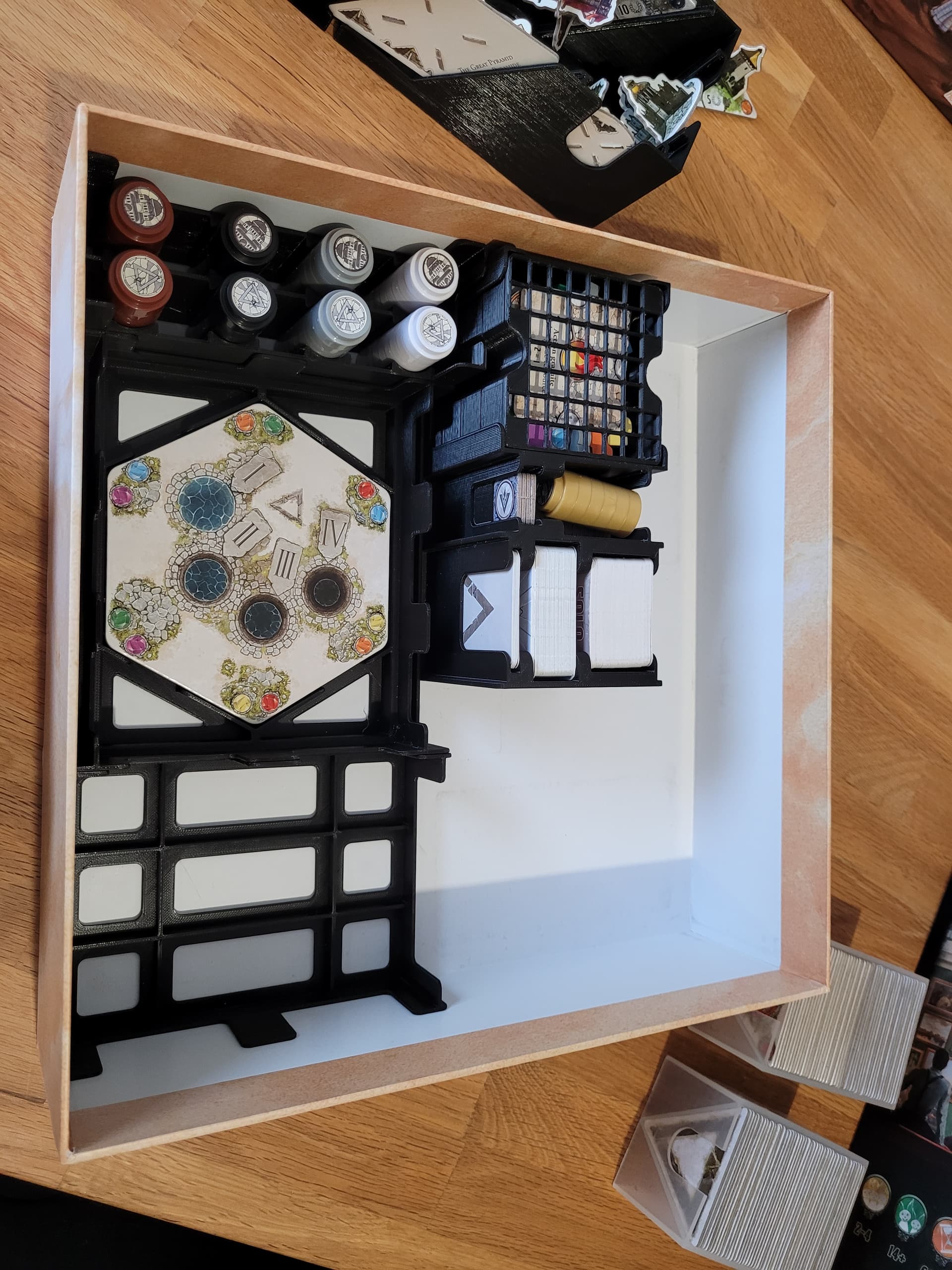 Grâce à une structure compartimentée, toutes les cartes et tuiles (jeu de base + extension Rise & Fall) tiennent dans la boîte de façon lisible et accessible, même en position verticale. Rien ne flotte, tout est calé.