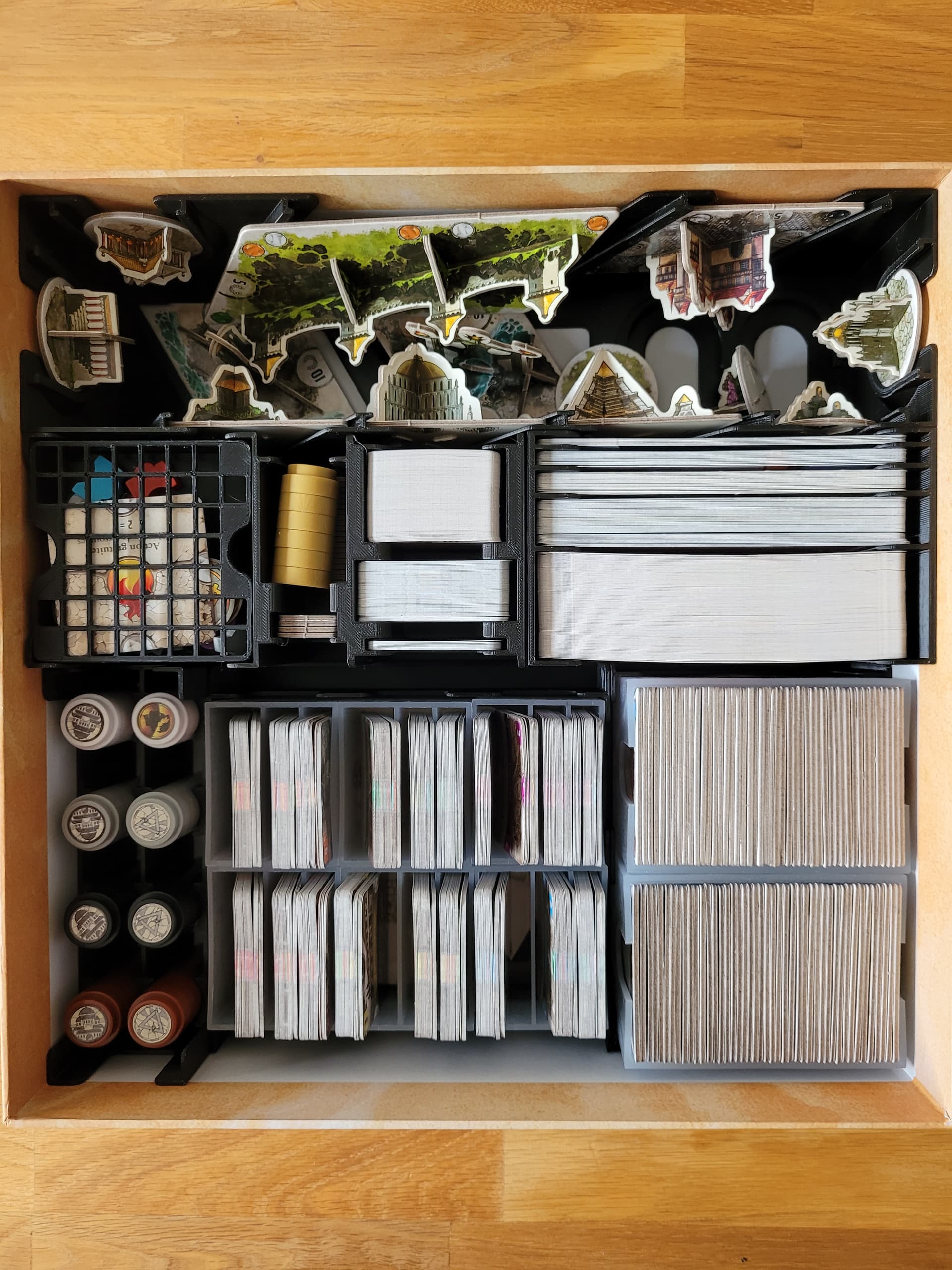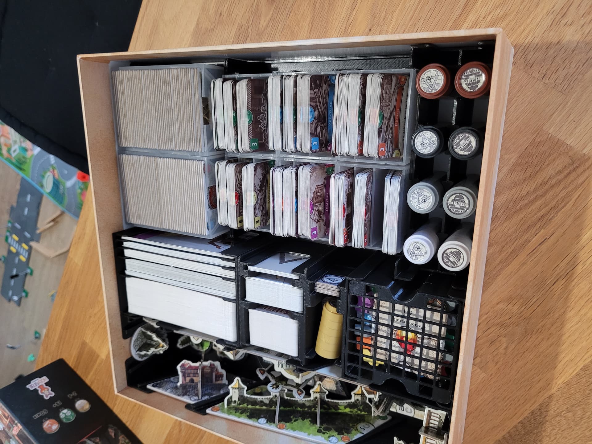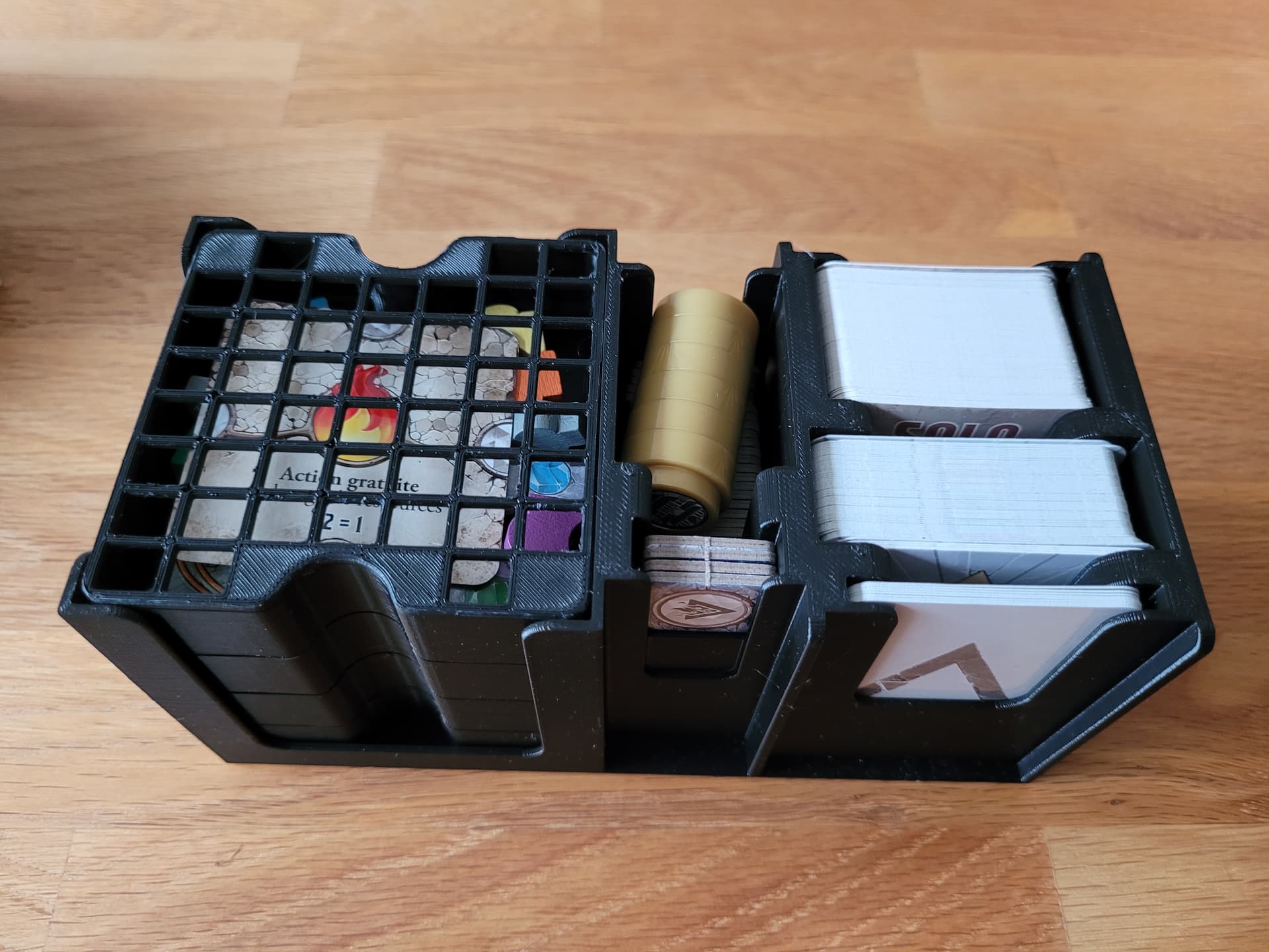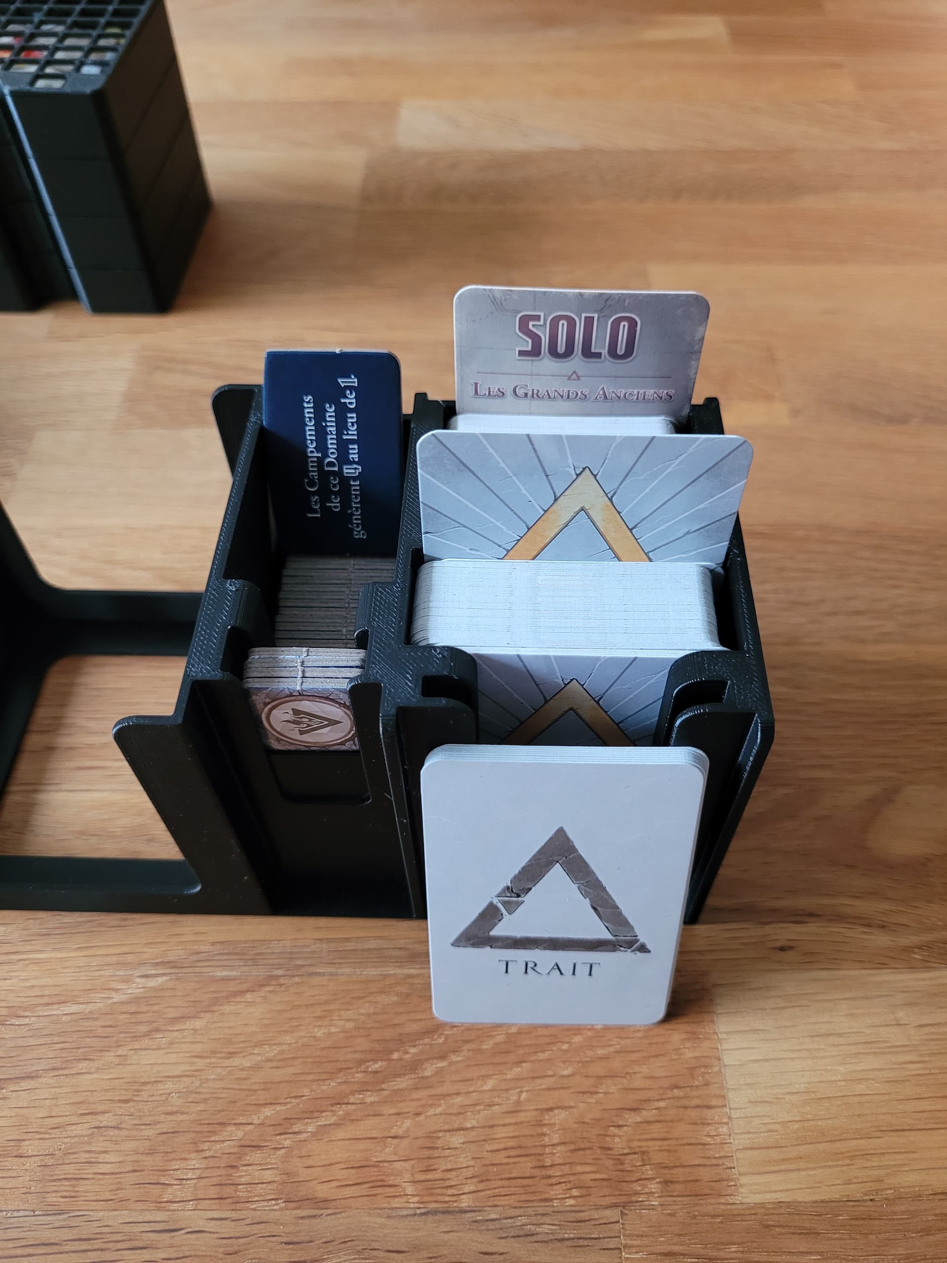 Les cartes sont triées par type et parfaitement maintenues dans des socles compartimentés, facilitant leur accès, tri et manipulation pendant la partie. Tout reste stable.