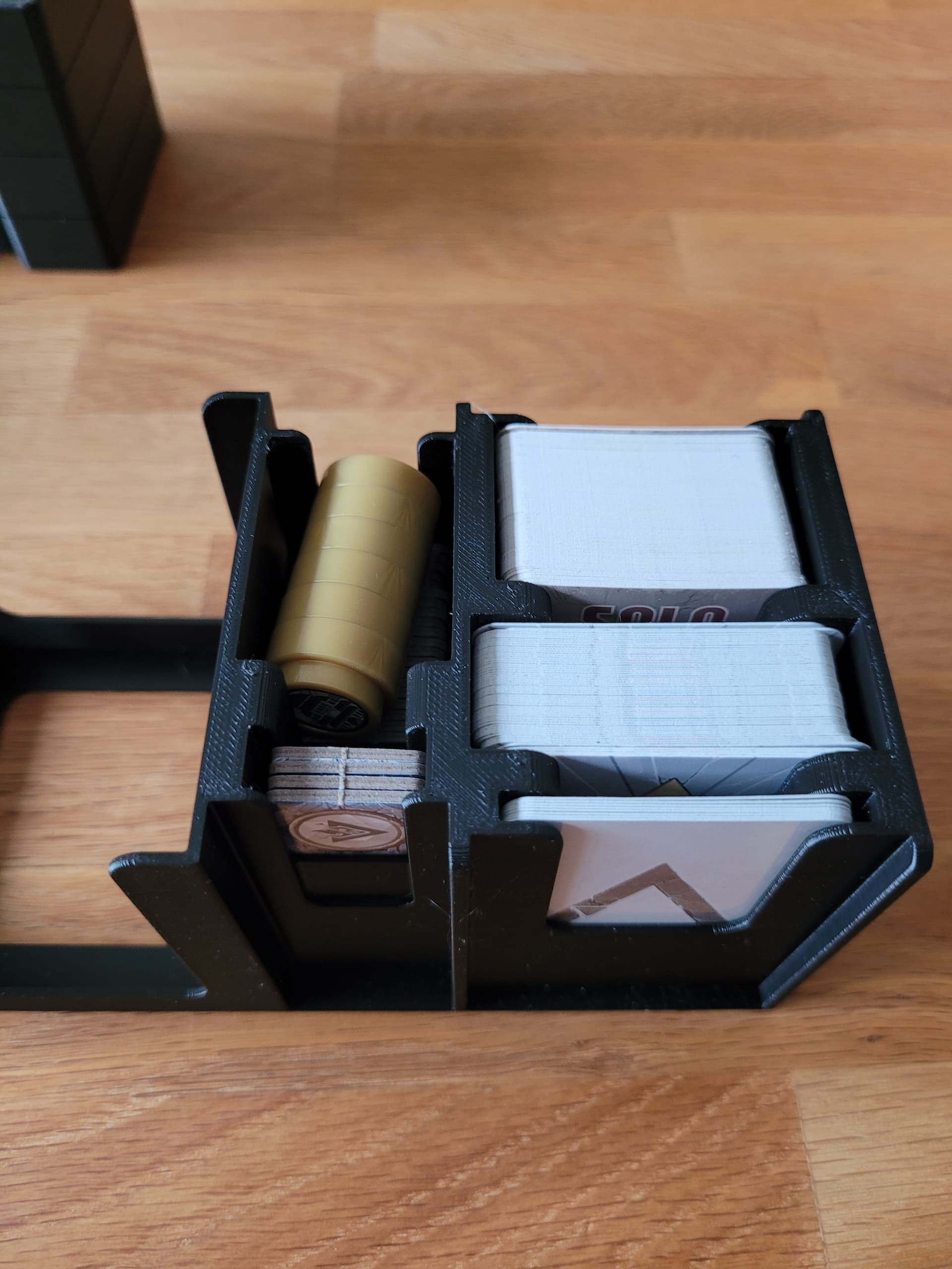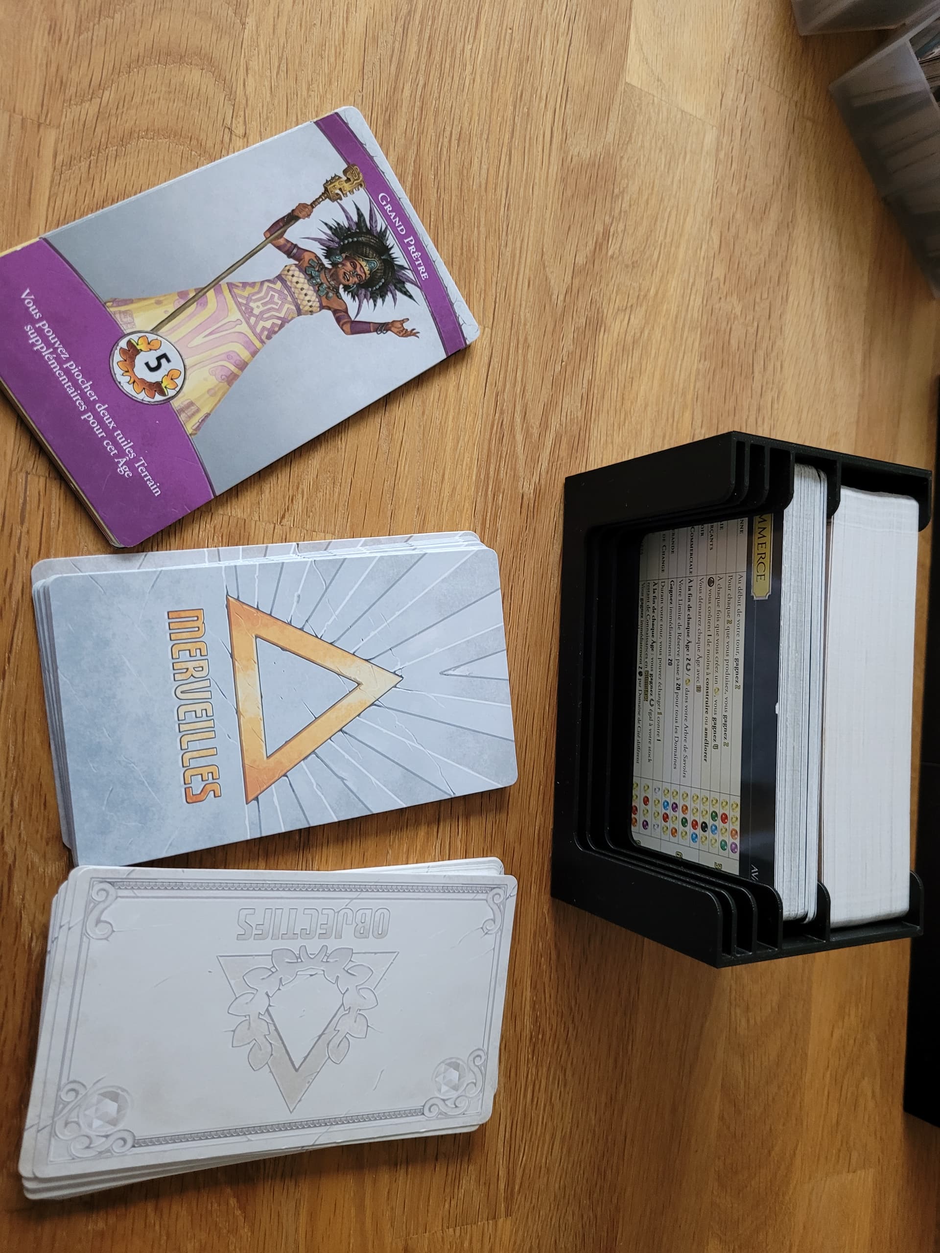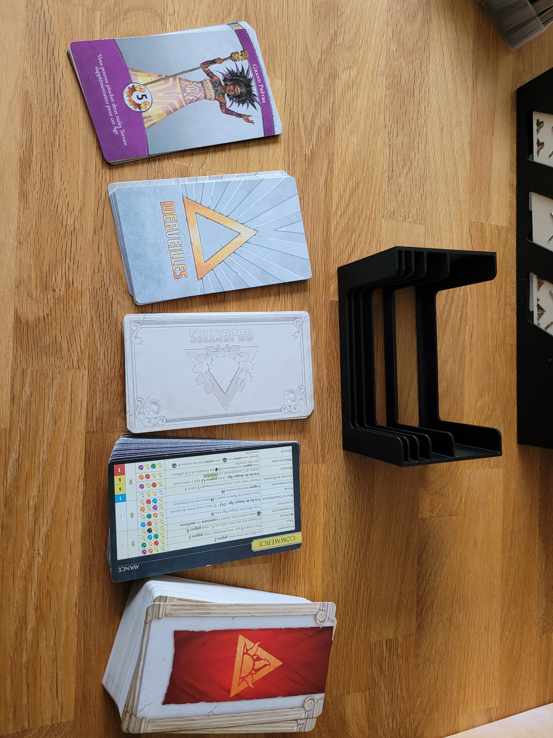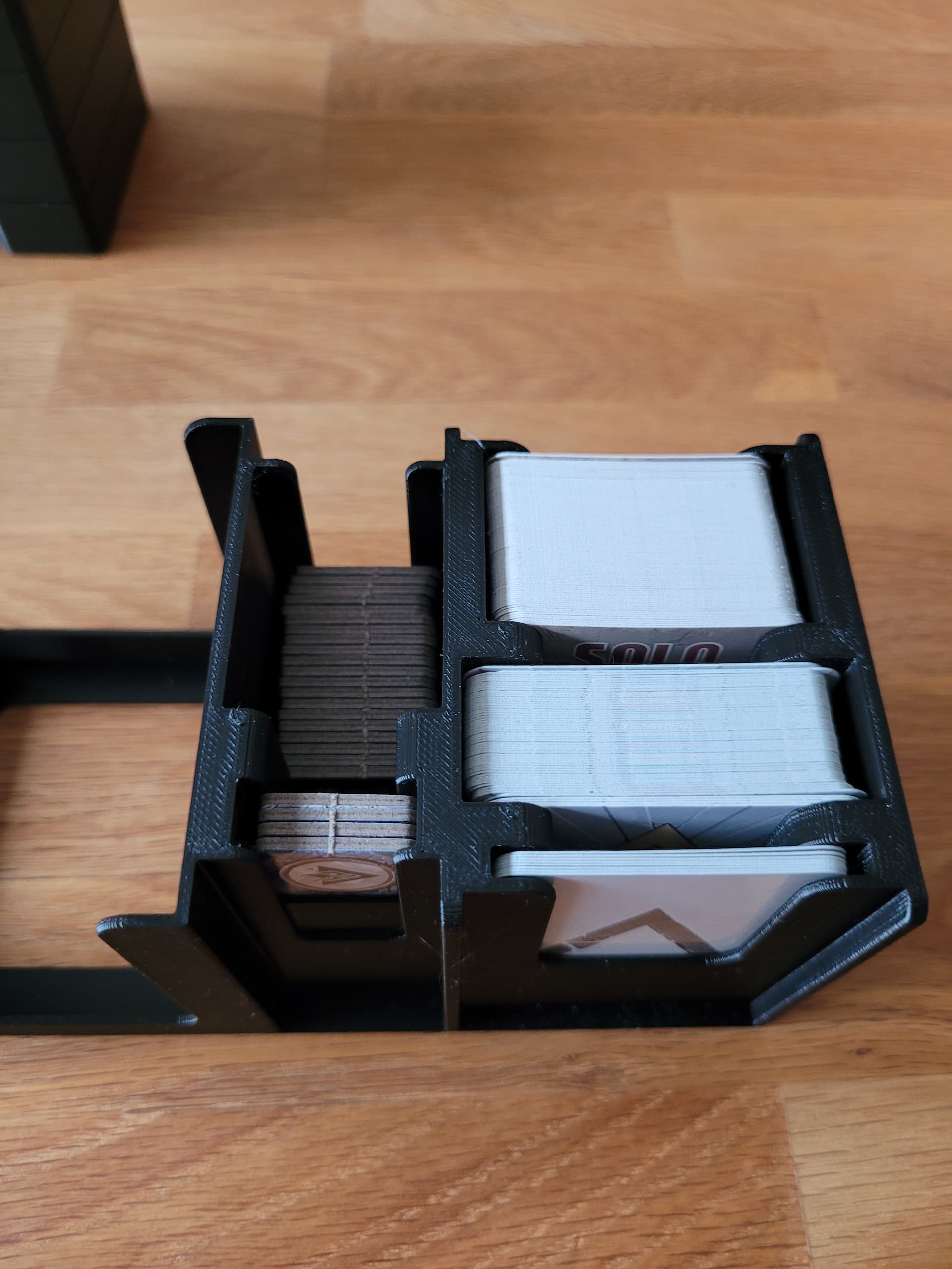 Les cartes sont triées par type et parfaitement maintenues dans des socles compartimentés, facilitant leur accès, tri et manipulation pendant la partie. Tout reste stable.