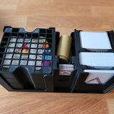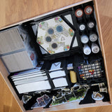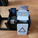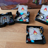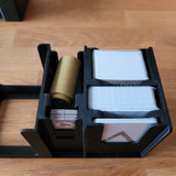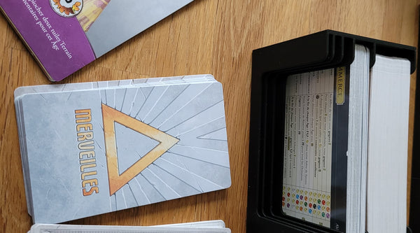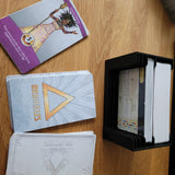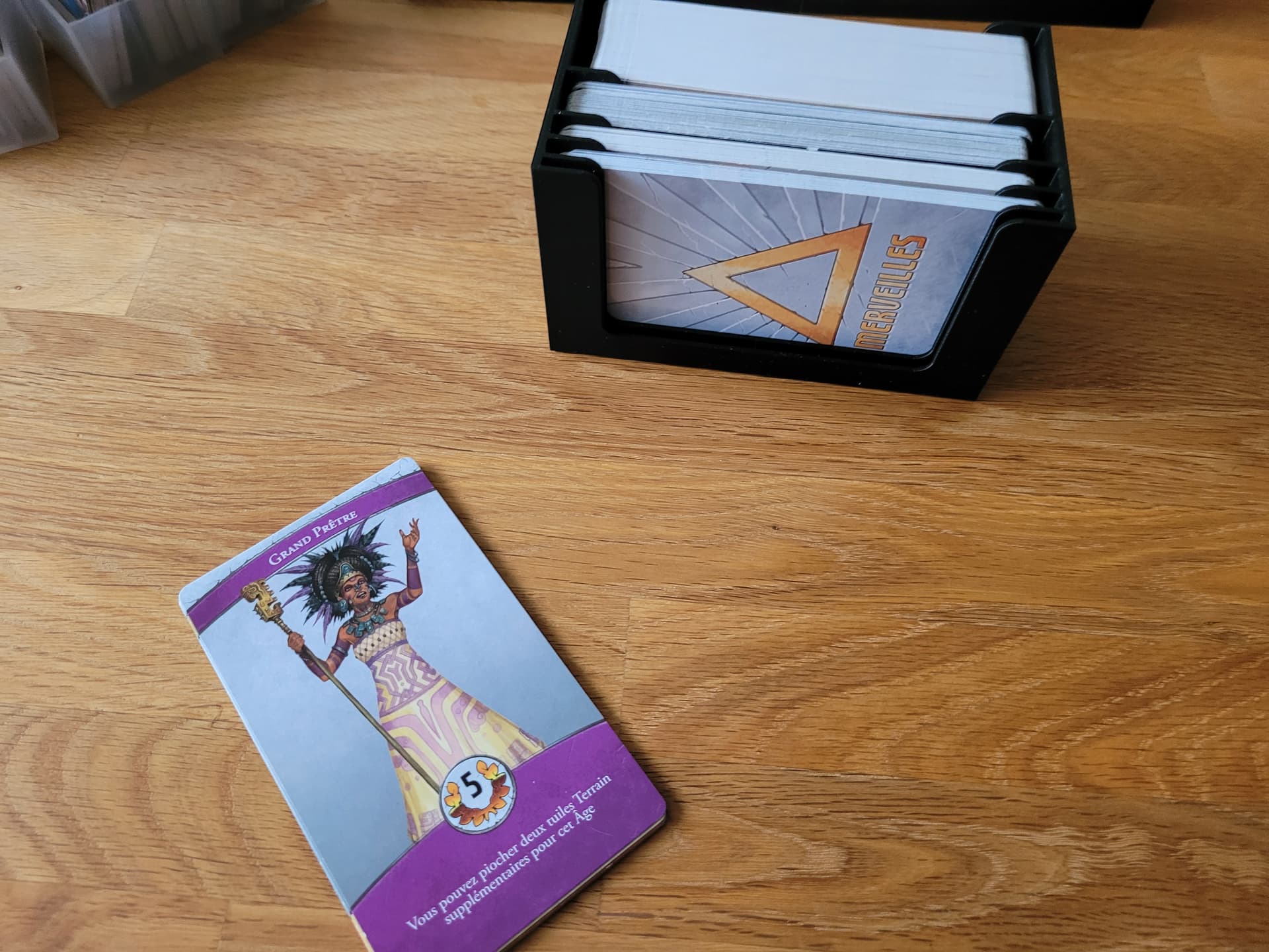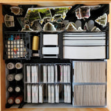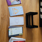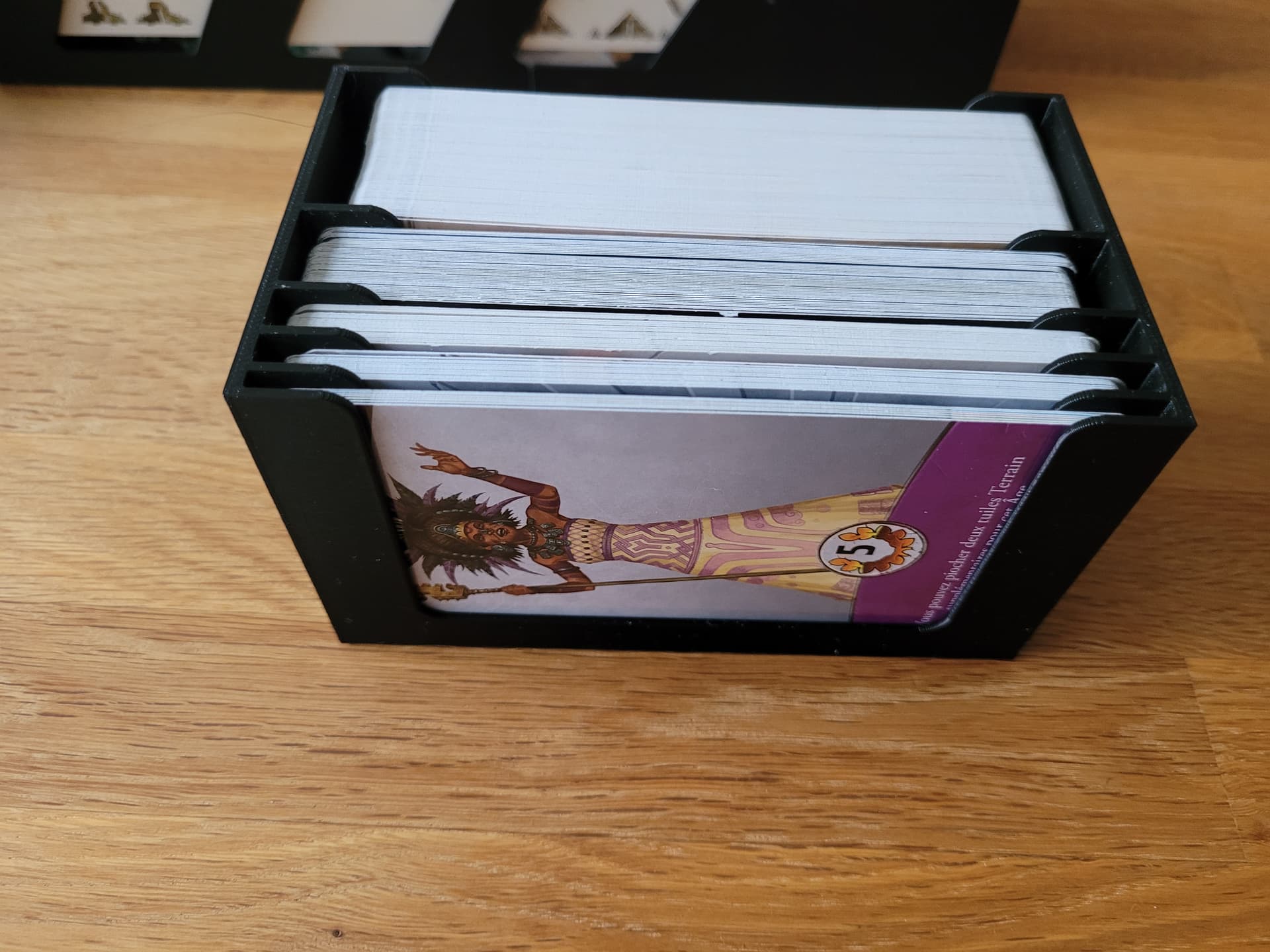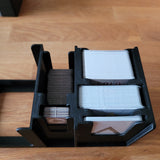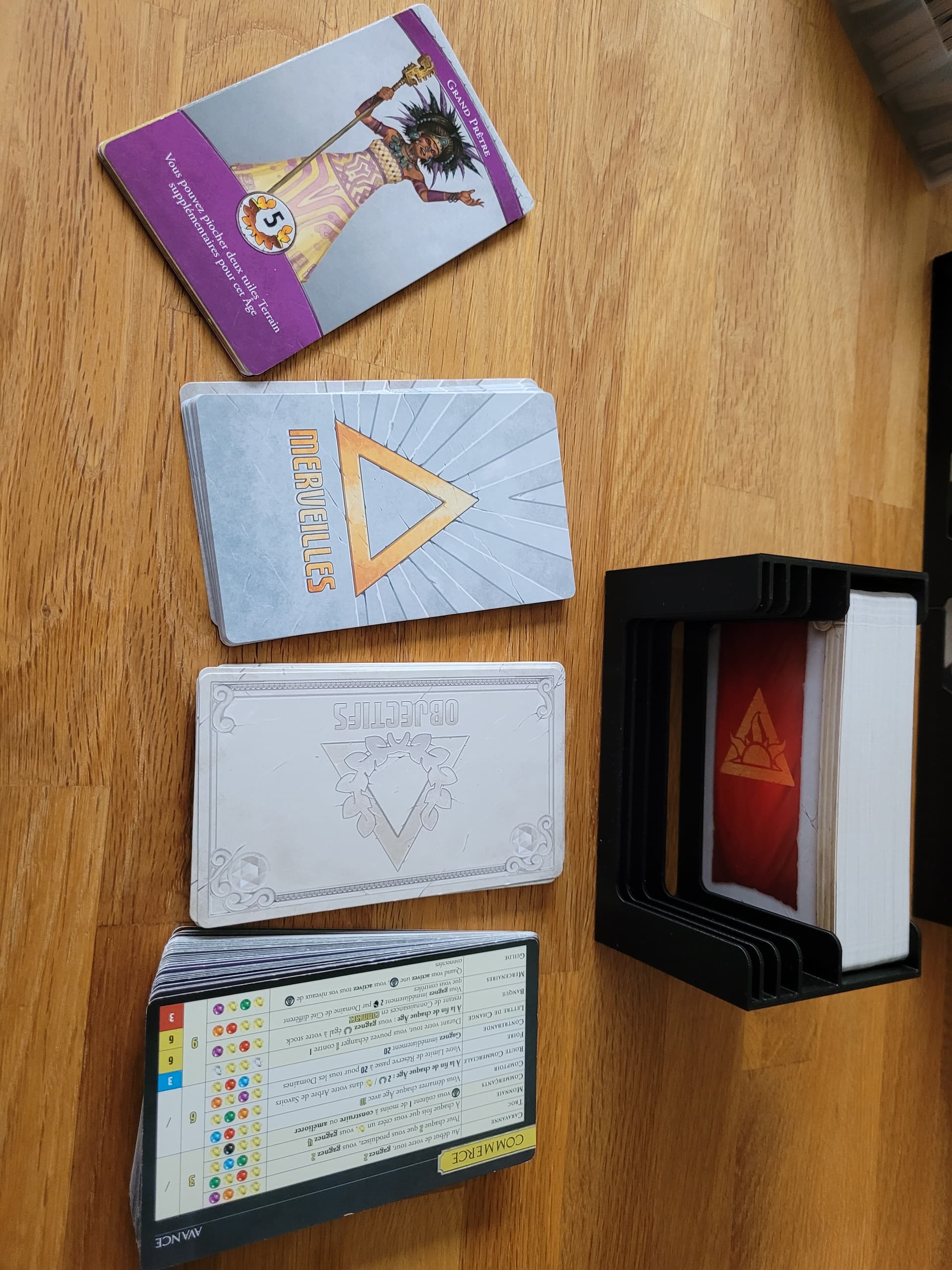 Les cartes sont triées par type et parfaitement maintenues dans des socles compartimentés, facilitant leur accès, tri et manipulation pendant la partie. Tout reste stable.