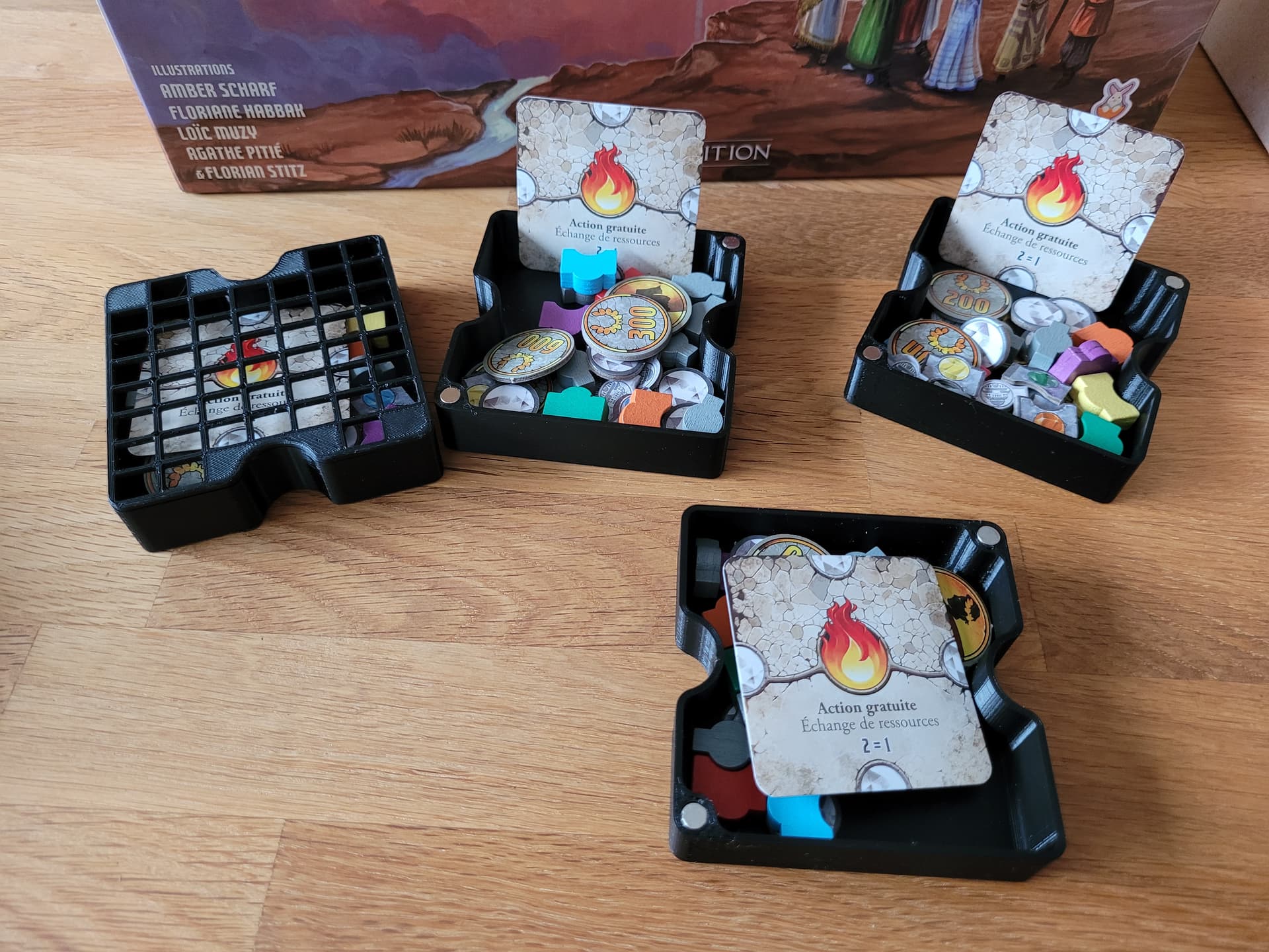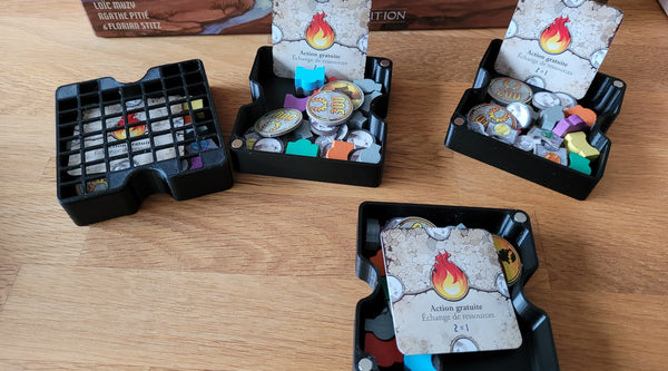 Les jetons et ressources sont stockés dans des bacs indépendants avec cartes d’action intégrées, que vous pouvez poser directement sur la table pour jouer. Fini les sachets, tout est prêt dès l’ouverture de la boîte.