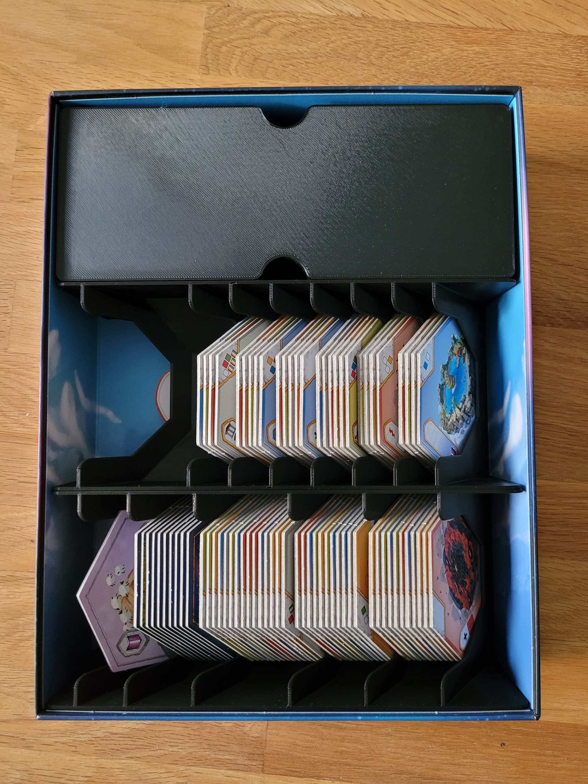 • Les jetons, cubes de ressources et tuiles supplémentaires trouvent leur place dans deux bacs distincts, fermés par un couvercle aimanté, pour un rangement propre et sécurisé.