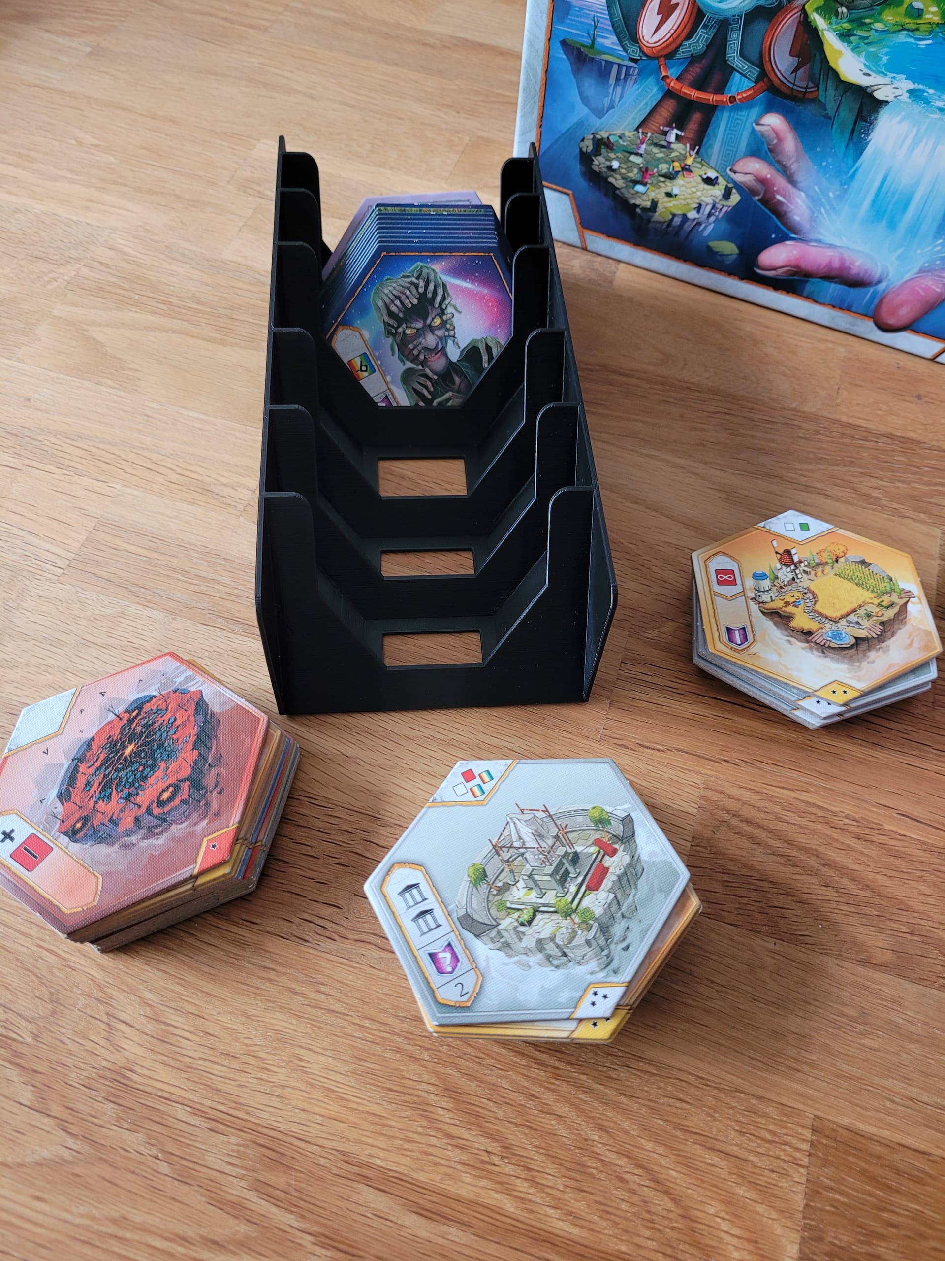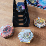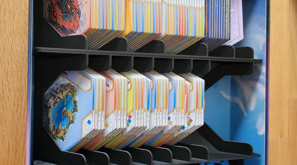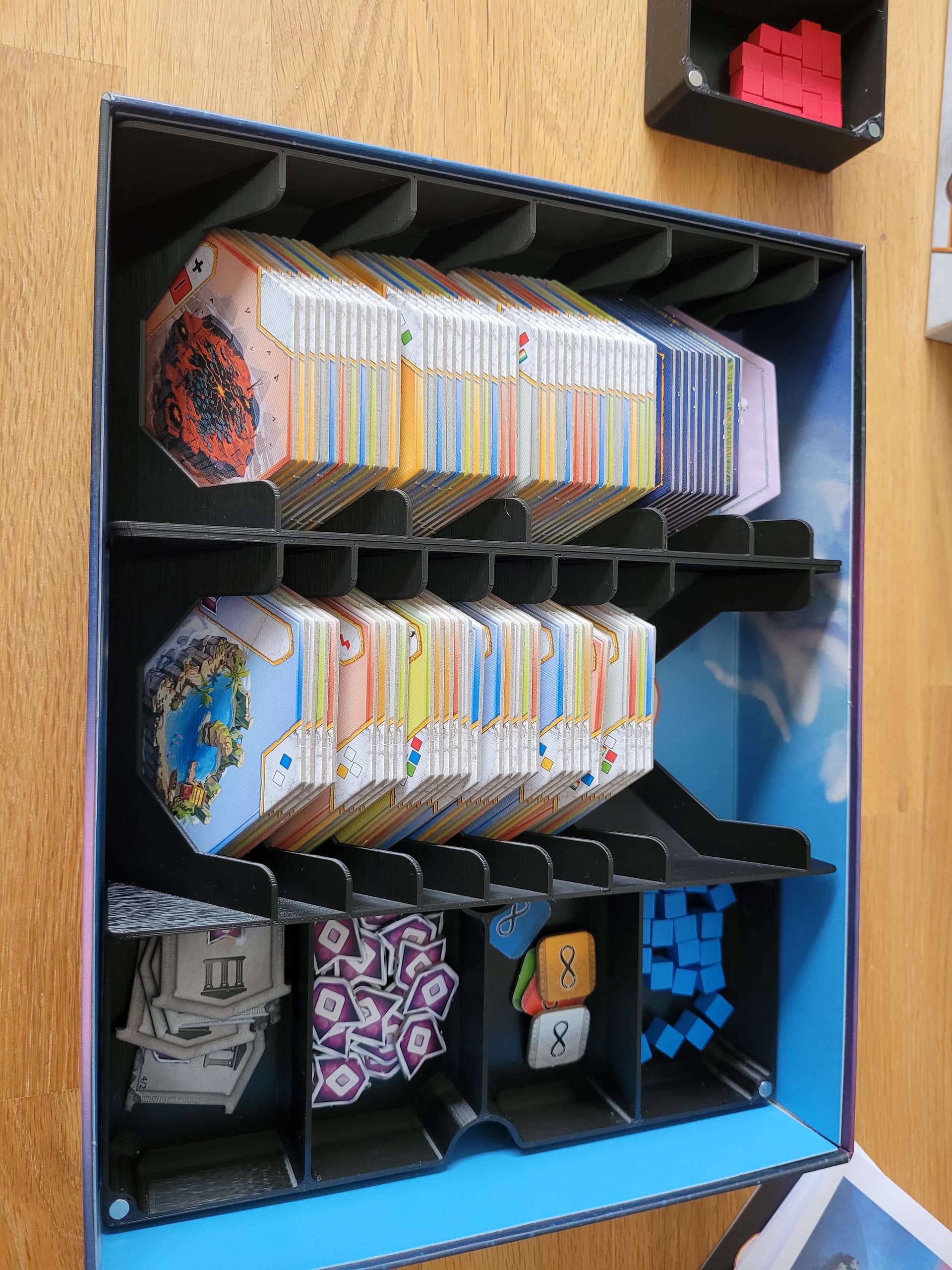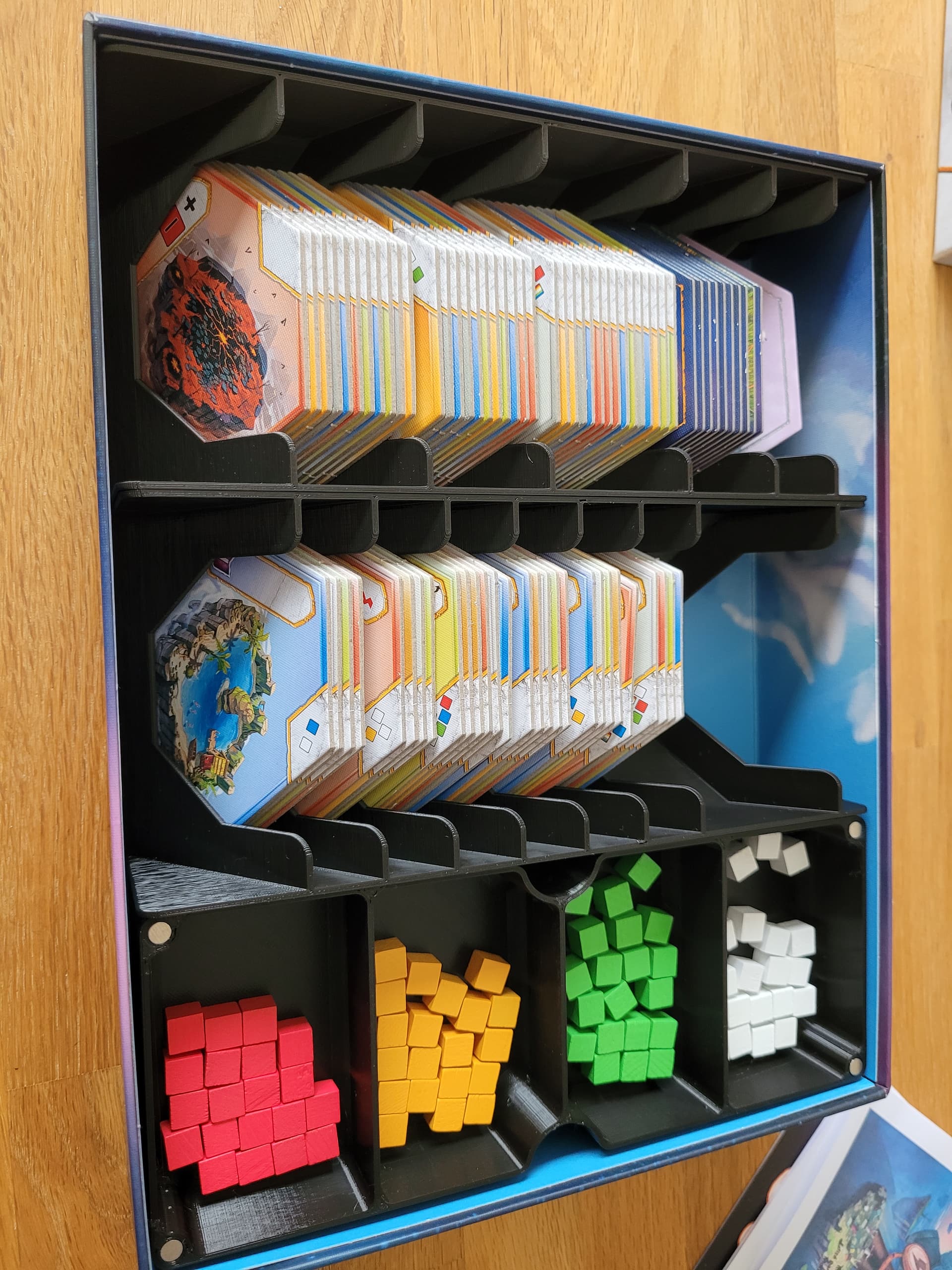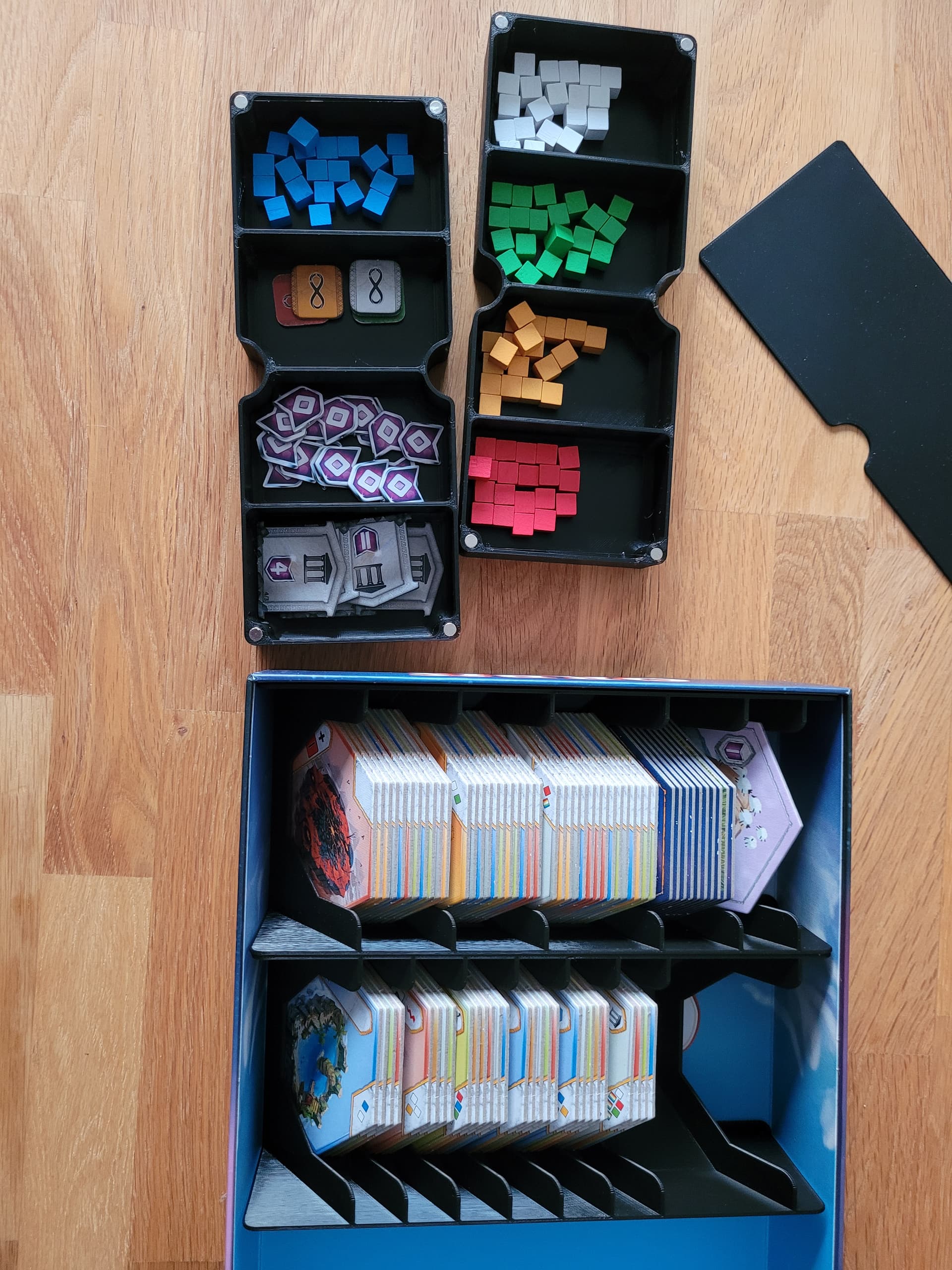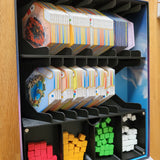 Les ressources (cubes, jetons, tuiles bonus) sont triées dans des bacs modulaires aimantés, chacun avec des compartiments dédiés. Posés tels quels sur la table, ils assurent une manipulation facile et un rangement sécurisé.