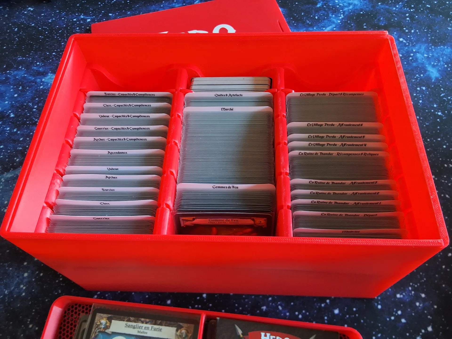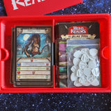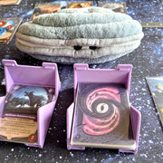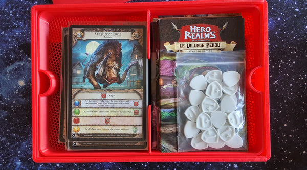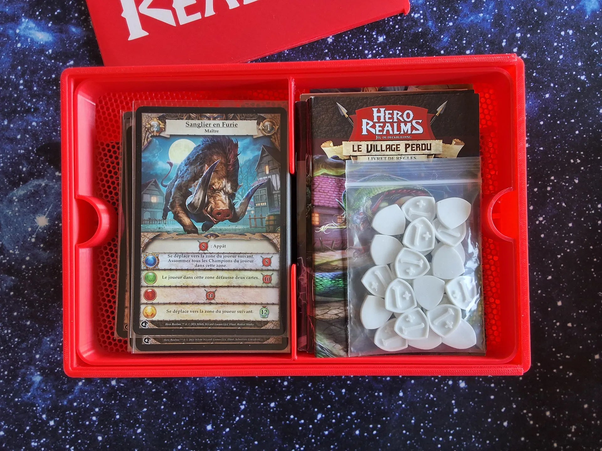 Comme le montre la photo du compartiment inférieur, la boîte accueille aussi bien les cartes grand format que les jetons de points de vie et les livrets de règles des campagnes. Plus besoin de stocker plusieurs boîtes ou accessoires : tout est réuni dans un format compact et bien pensé.
