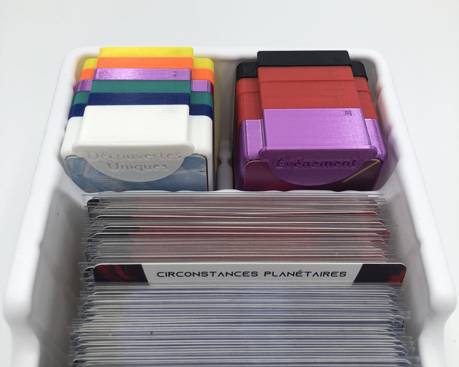 Ces modules vous permettent de classer et de protéger vos cartes essentielles, facilitant l'accès rapide pendant le jeu et offrant une solution de rangement sécurisée entre les sessions. Les couvercles fournis pour les modules "Découverte Unique" et "Événement" assurent une protection supplémentaire et maintiennent les cartes en place lors du transport ou du stockage.