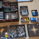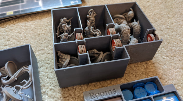 Les figurines du héros, des monstres et des sbires sont parfaitement séparées dans des compartiments sur mesure, incluant des espaces pour les jetons associés, facilitant la mise en place rapide selon le scénario.