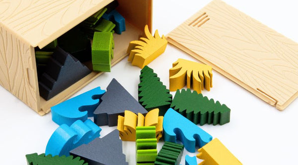 Rangement optimisé Bacs thématiques pour jetonsUn module unique en imitation bois accueille arbres, rivières, montagnes et autres éléments, pour un tri pratique et thématique.
