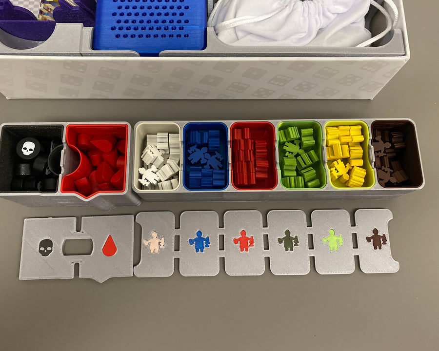 Dans Dice Hospital, les Blocs Centraux Amovibles pour médecins et jetons de sang et tête de mort allient fonctionnalité et immersion. Le bloc médecins, placé au centre de la table, facilite l'accès aux pions essentiels, reflétant le dynamisme d'un hôpital en activité. Le bloc pour jetons, quant à lui, propose une double organisation : un compartiment supérieur pour les jetons de l'édition deluxe et un espace caché en dessous pour les jetons en carton de la boîte de base. Cette conception ingénieuse permet une transition fluide entre les versions du jeu et une mise en place rapide, tout en conservant une table de jeu ordonnée et fonctionnelle.