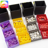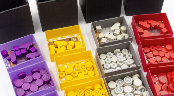 Chaque ressource à sa place Rangement coloré et intuitifEn savoir plusLes pions en bois et jetons sont triés dans des bacs individuels par couleur et type, pour un accès rapide et une mise en place simplifiée.