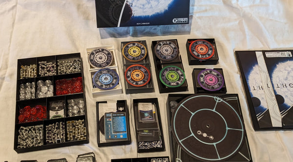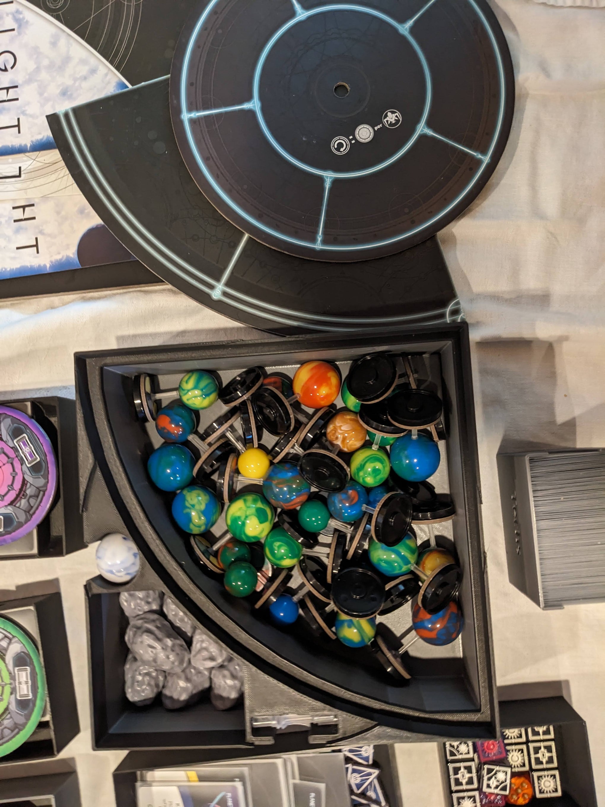 Disques de faction, ressources, dés, plateaux et cartes sont séparés dans des bacs individuels. Un setup ultra fluide, un rangement rapide et clair, pensé pour accélérer les parties à 4 ou 5 joueurs.