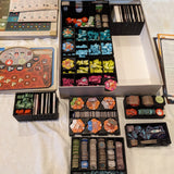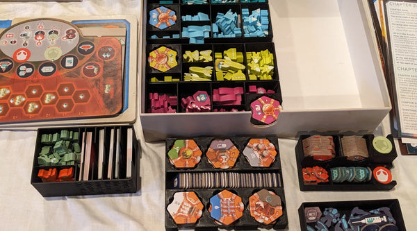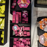 • Rangement logique par type de matériel : ressources, tuiles hexagonales, cartes, tokens de mission et objectifs sont parfaitement séparés, dans des contenants étiquetés en relief pour une lisibilité optimale.