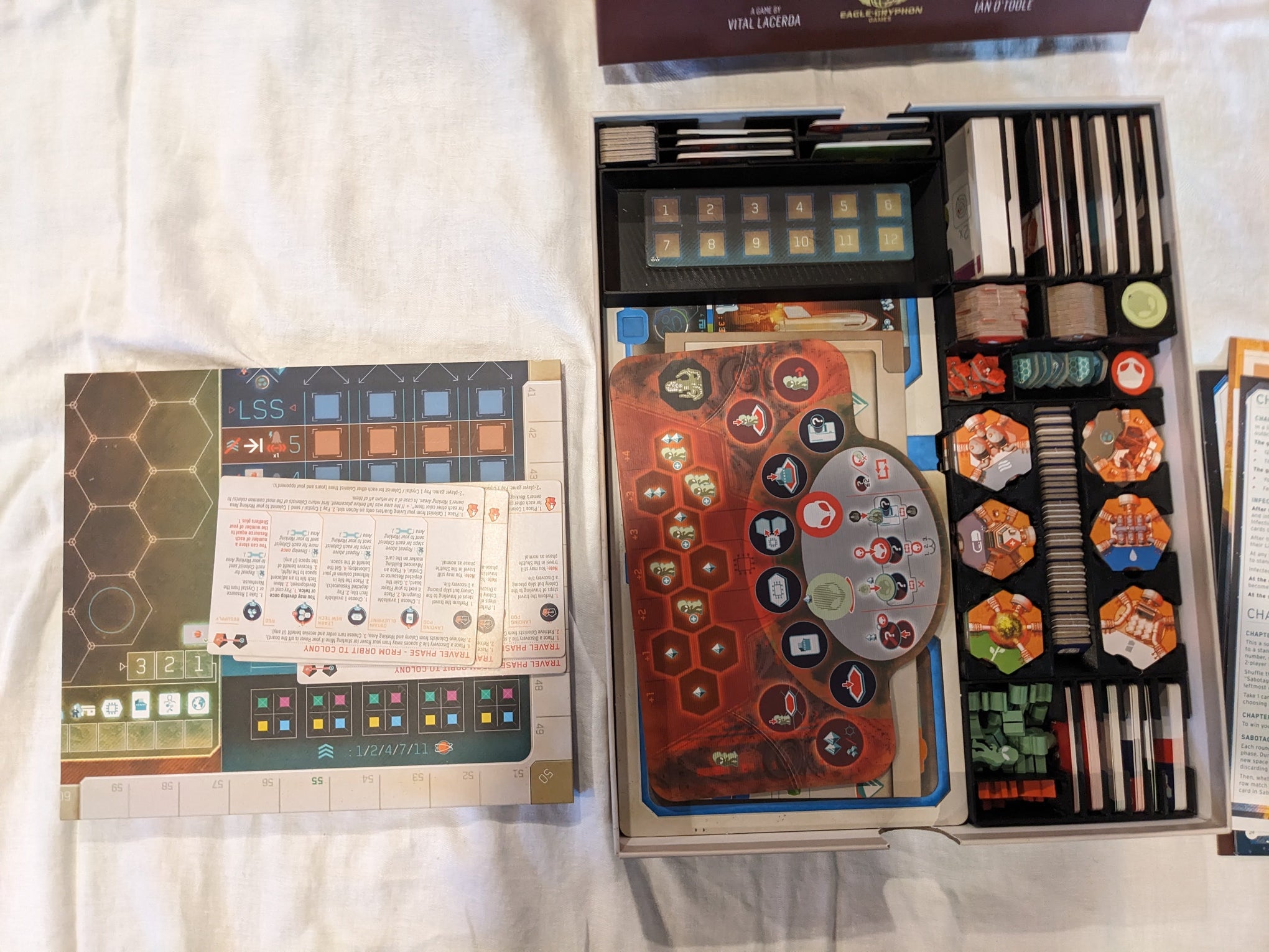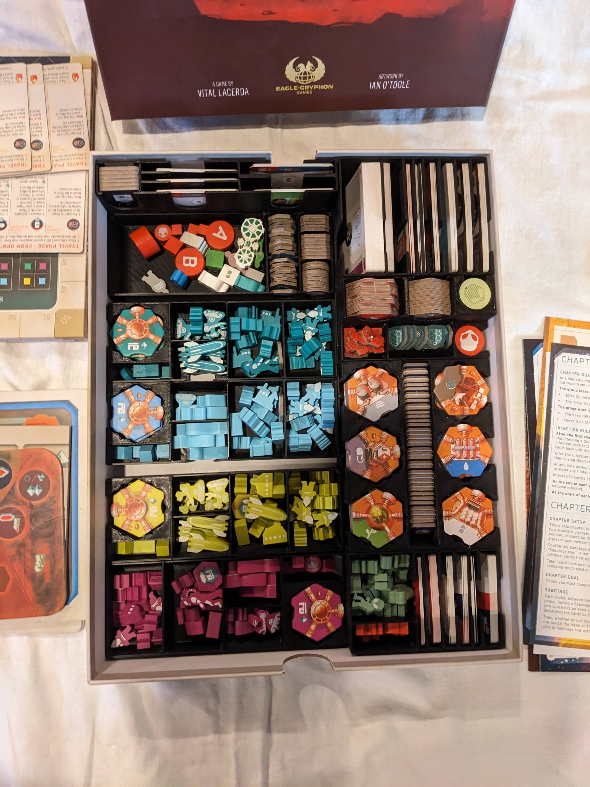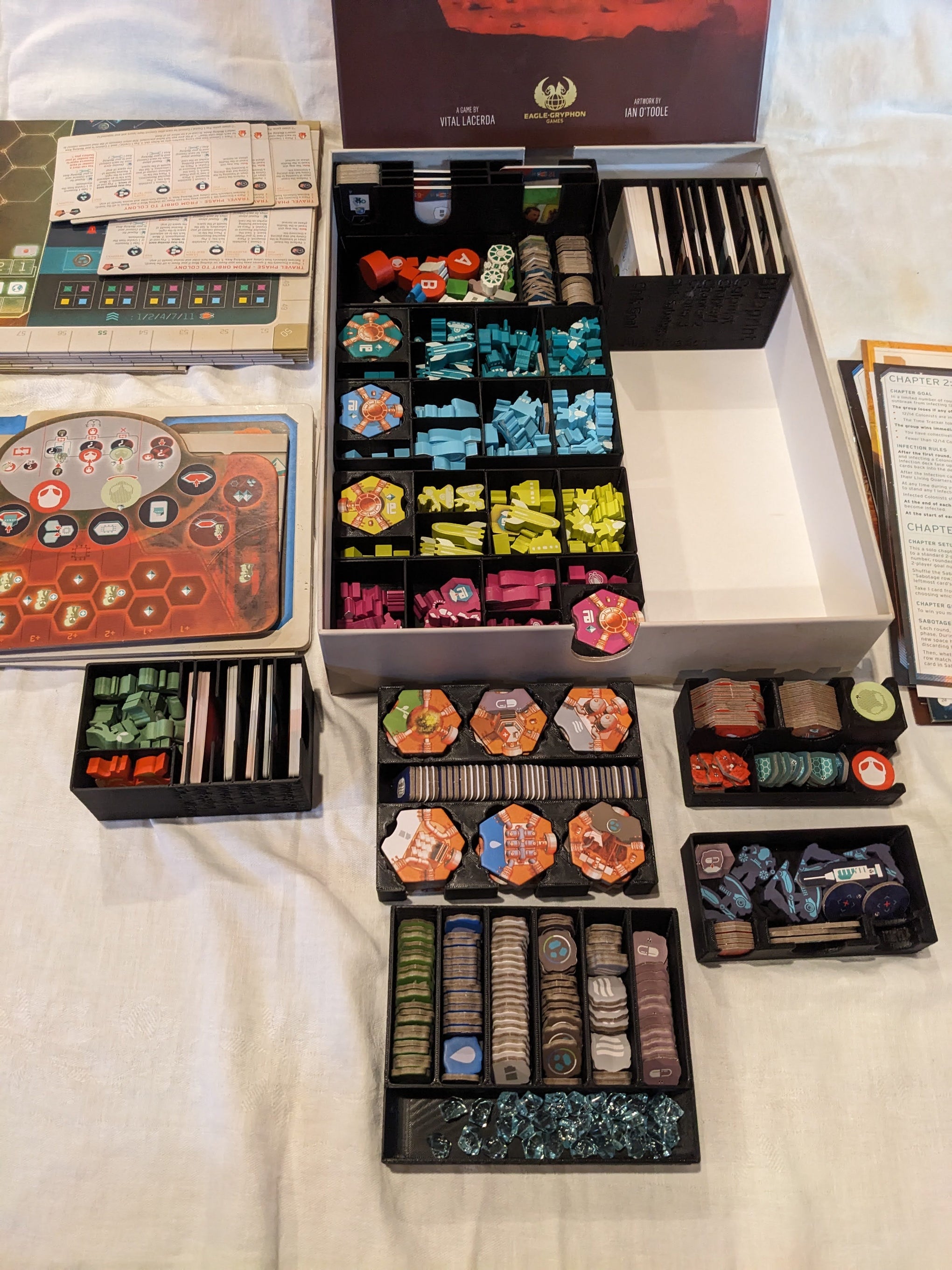 • Rangement optimisé pour les tuiles LSS, tuiles technologies, objectifs, ressources cristallines, bâtiments de colonie, et cartes événement.