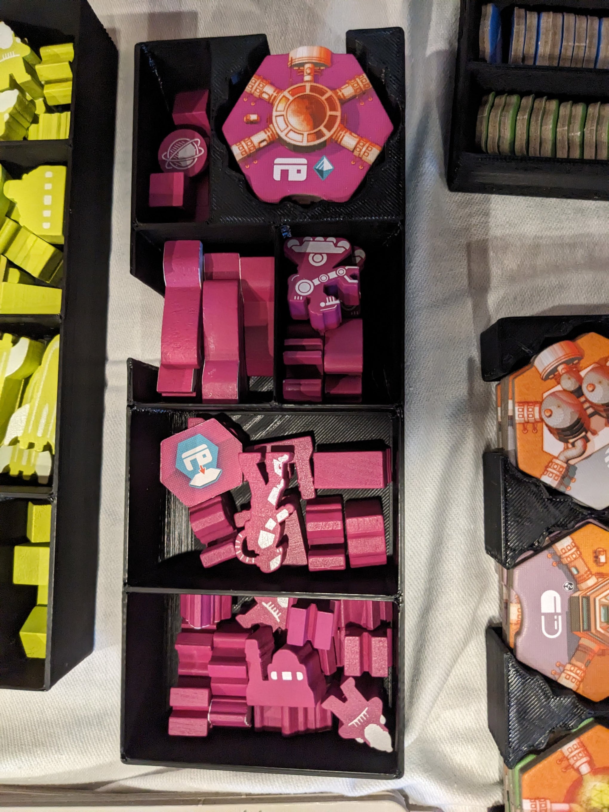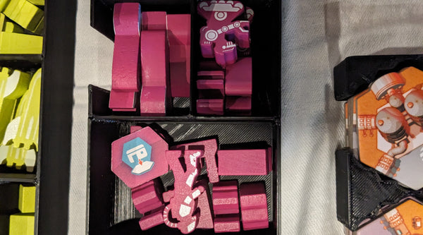 • Bacs individuels par joueur : chaque couleur dispose de son propre bac dédié, regroupant les bâtiments, rovers, technologies et ouvriers. Ces bacs peuvent être sortis et posés directement en jeu.